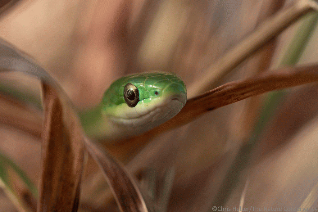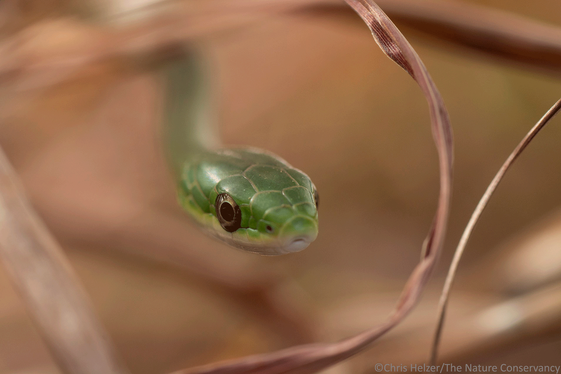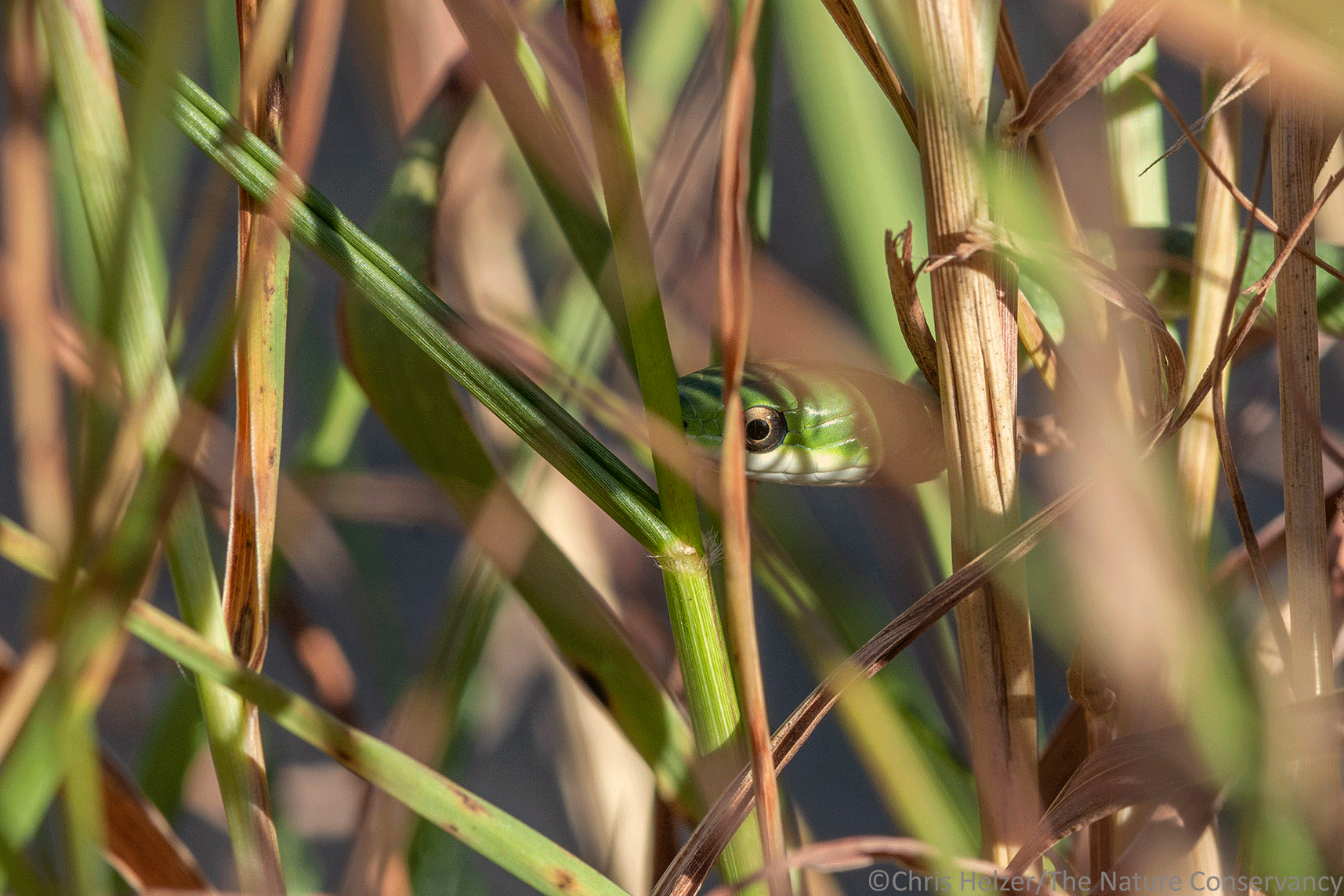 After an hour so along the edge of the wetland, I started back toward the road to make sure I’d be at the trailhead when Kim came past. Right as I got near the edge of the road, though, I had to stop again for a while because I spotted a tiny rough green snake in a small patch of grass. The snake was only about 8 or 9 inches long and was about a foot off the ground when I first saw it.