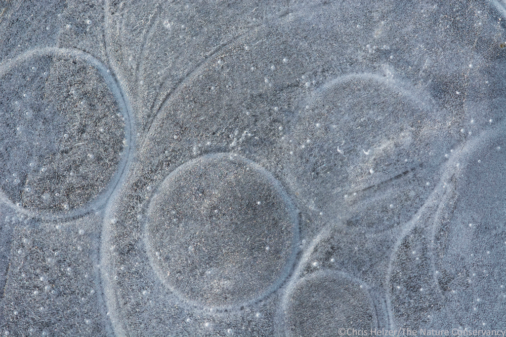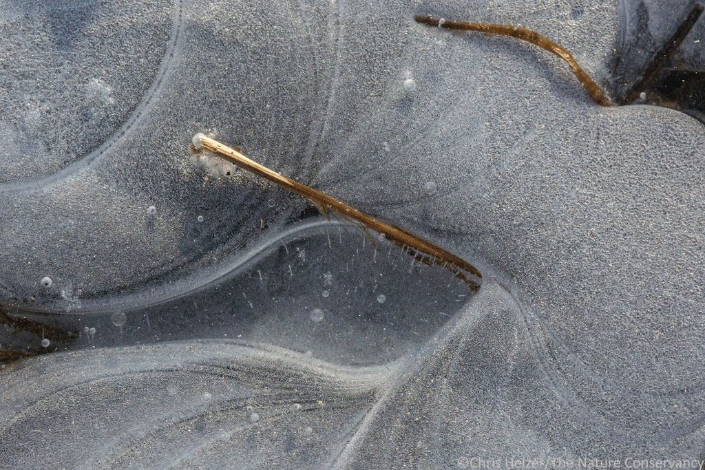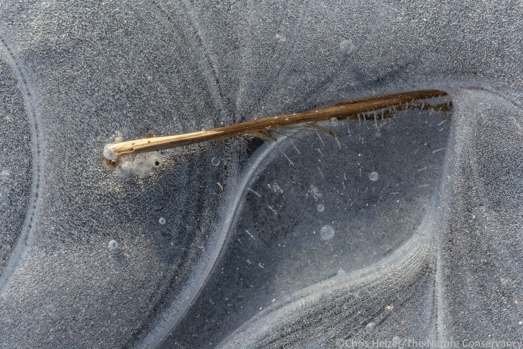 Over the weekend, I went out to our family prairie to see if the high winds from the previous week had caused any damage. Everything looked fine from that standpoint, so I wandered down to the pond to see if there was any fun ice to photograph. The main pond had a thin skin of ice across it, but not much for patterns. Along the edges, though, there were some small pockets of ice that had some interesting lines and texture so I explored those for a little while.