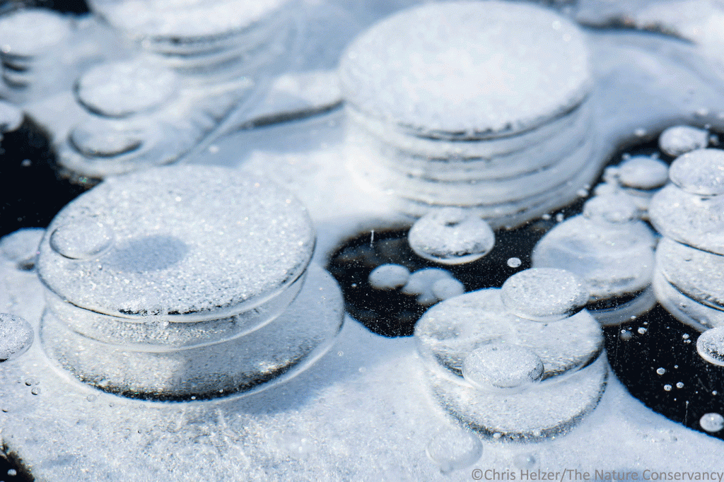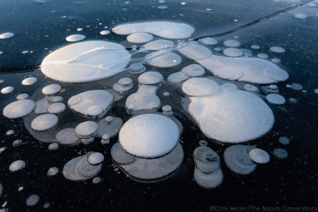 Those of you who have been around this blog for a while probably know about my obsession with photographing ice bubbles. I don’t understand all the intricacies of how those bubbles are created, but I think there are at least two forces in play. One is the release of methane and other gases as decomposition occurs underwater. More importantly, I think, those gases are forced out of water as it freezes and have to accumulate someplace. Since ice forms from the water’s surface downward, that gas can’t escape upward, so it is forced into spaces within the water itself – forming bubbles.