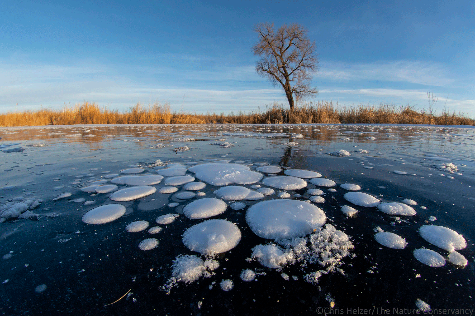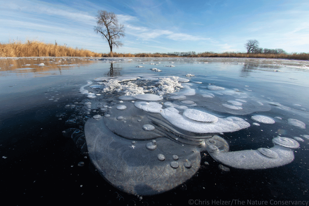 On Monday morning of this week, I went to my favorite restored wetland at the Platte River Prairies, hoping to find some fun ice patterns to photograph. It had gotten very cool very quickly, and that often creates some of the best conditions for ice bubbles. What I found was far better than I’d expected. Not only were there the kind of small bubbles I’m used to (dime and quarter-sized and smaller), there were also much bigger bubbles – up to a foot or more in diameter. I’m assuming that was linked to how quickly the water froze, but that’s just a guess. Either way, it was spectacular!