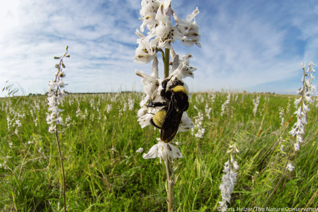 An American bumble bee (Bombus pensylvanicus) feeds busily in a patch of prairie larkspur in the Derr West 2002 Restoration last summer.