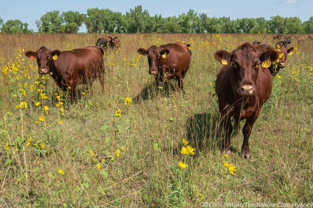 Cows grazing the Derr West restoration this past summer (2021) in a burned patch. You can see a lot of big bluestem and other grasses grazed very short (but many still blooming), as well as both perennial and annual sunflowers – some of which are grazed. This kind of grazing intensity is always followed by a few years of recovery before the next burn/graze event.
