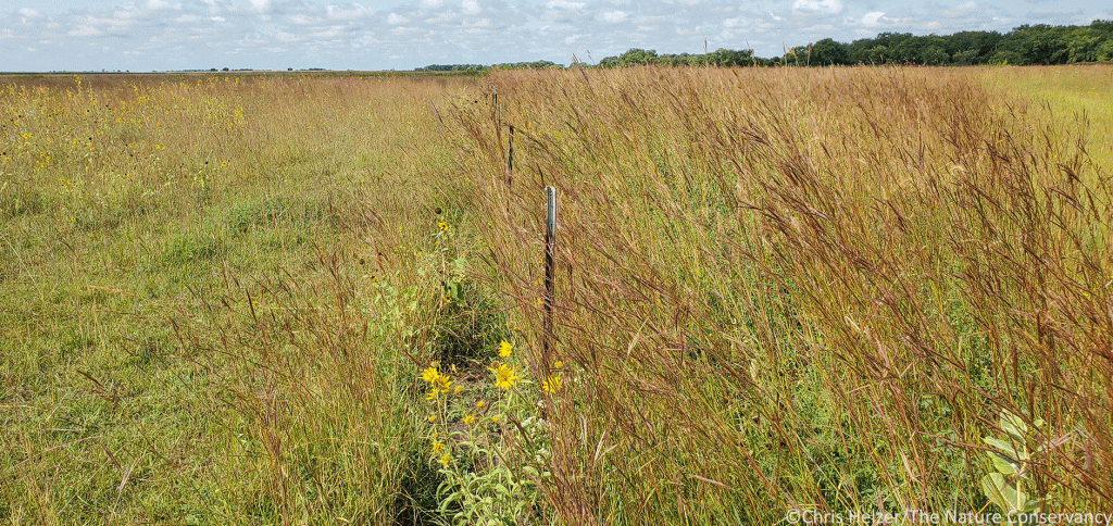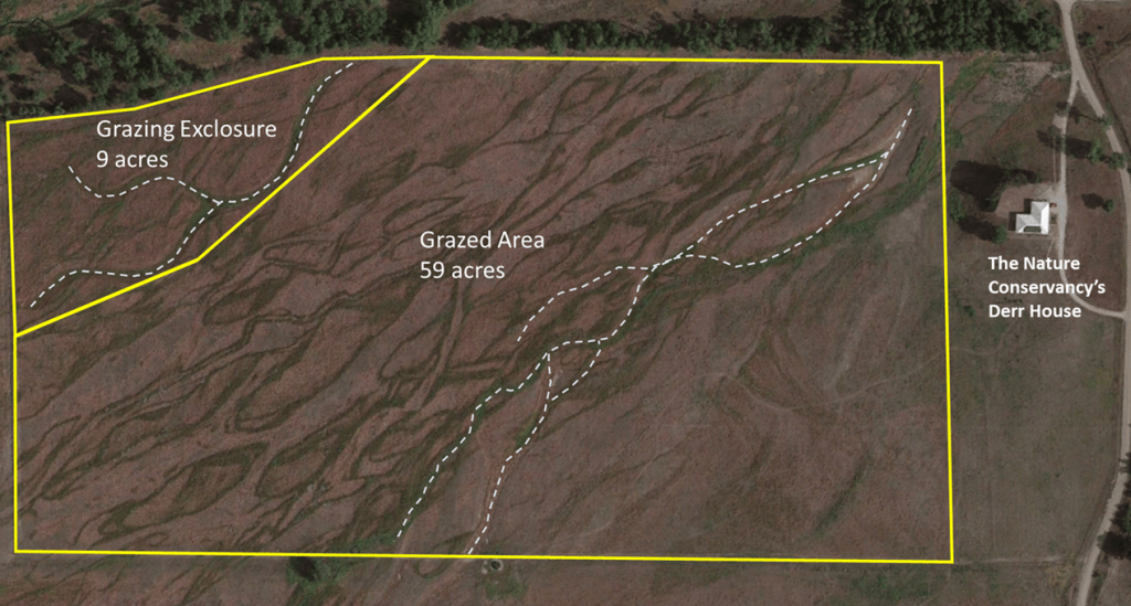 The 9 acre grazing exclosure from the air in 2021. You can tell from the orange-color that there’s a lot higher density of flowering big bluestem and Indiangrass in the exclosure than in the surrounding grazed area, which was burned in the spring and in the midst of intense grazing when this photo was taken.