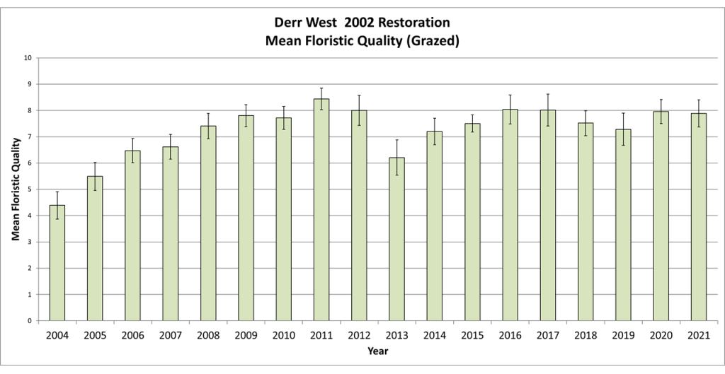 Most importantly to me, the grazed area, which definitely has more heterogeneous habitat (other data not shown here) doesn’t seem to be showing signs of degradation due to the grazing management we use to manage it. Mean floristic quality remains stable and we’re not seeing local extinctions of any plant species. We’re creating a wider range of habitat while still maintaining a diverse plant community.