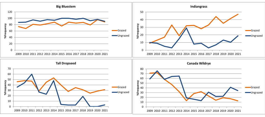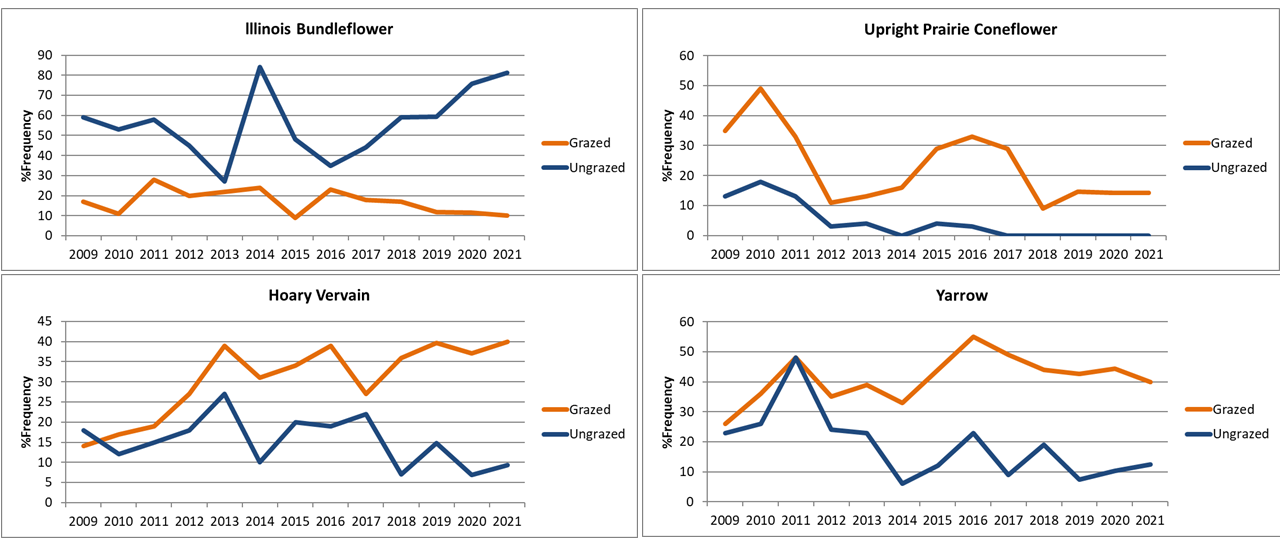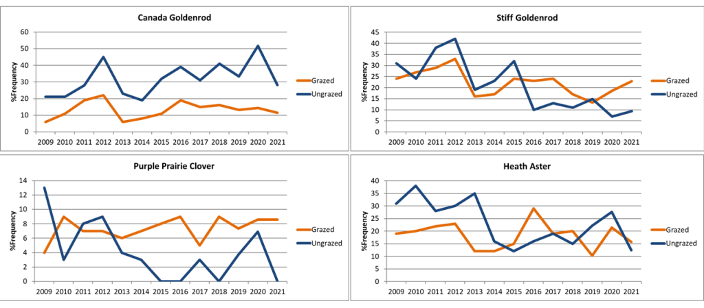 Canada goldenrod hasn’t changed much over time and seems unaffected by grazing. Stiff goldenrod and heath aster look like they do a little better outside the exclosure, but that difference is stronger in heath aster than the goldenrod. Purple prairie clover is found mostly in localized patches across the site, so the overall frequency of occurrence numbers are too small to draw too much from. However, it looks like it might be doing less well in the exclosure than in the grazed area.