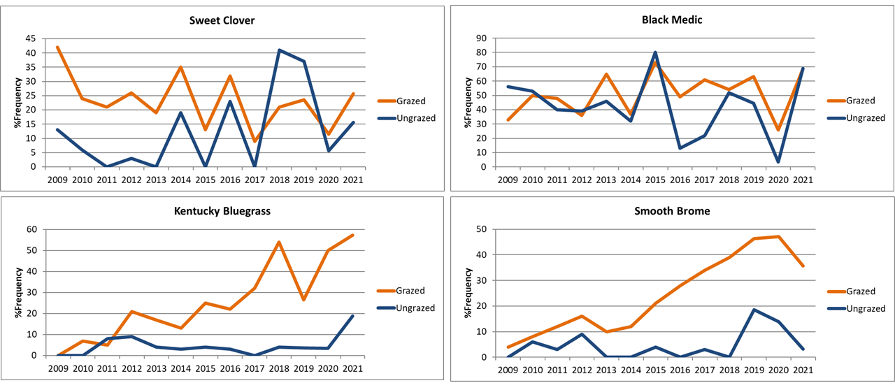 Sweet clover (biennial) has an episodic pattern, but seems to be growing more abundant in the exclosure, while declining somewhat in the grazed area. Black medic does its own thing. Both Kentucky bluegrass and smooth brome are increasing steadily over time in the grazed area. However, as I’ve seen in our other older restored sites, those increases in invasive grasses don’t seem to be causing decreases in species diversity or mean floristic quality. Maybe our grazing management keeps their dominance suppressed, even as they spread, but we will continue to watch that very closely.