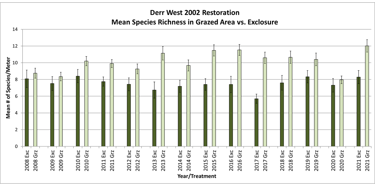 The next two graphs show the same time period depicted in the first graph, but include comparisons between the data from the grazed portion of the site and the ungrazed exclosure. The first graph shows mean floristic quality again and the second graph shows mean species richness, which is simply the average number of plant species found within those 1x1m plots each year.