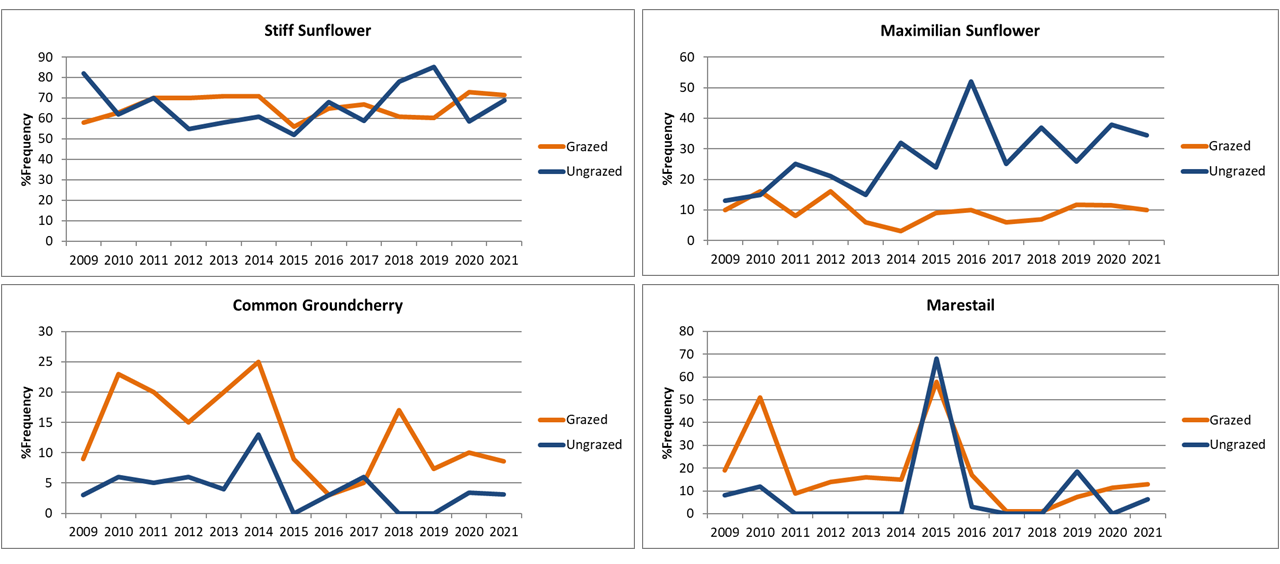 Stiff sunflower does well in both grazed and ungrazed areas, but Maximilian sunflower seems like like the exclosure best (but is persisting in the grazed area at about the same level as before grazing was introduced.) Common groundcherry (Physalis longifolia) seems to respond positively to grazing. Interestingly, marestail (Conyza canadensis) seems to pulse in abundance independent of grazing (what happened in 2015??)
