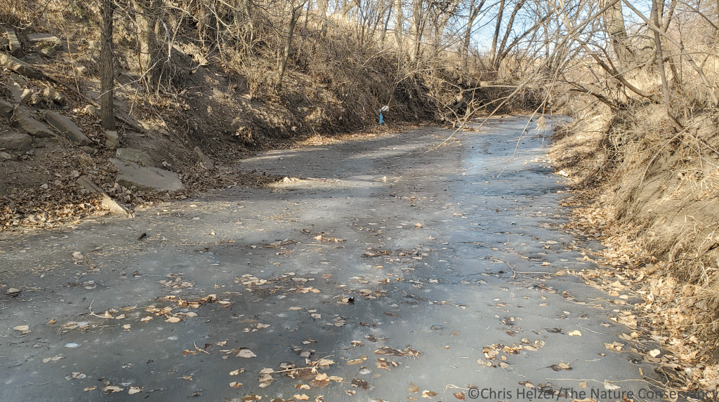 I was planning to walk the prairie in search of interesting seeds or anything else that caught my eye. As I walked past the creek itself, however, I noticed with some surprise that it appeared to be still frozen. I guess the high banks and trees kept it shaded enough that even with recent warm weather, it hadn’t yet thawed. I gingerly tested the ice depth and found it sufficient to hold my weight. The surface of the ice was littered with leaves and seeds (as well as some less attractive litter like cans, plastic bags, etc.). I started walking slowly with my eyes down, scanning for anything interesting.