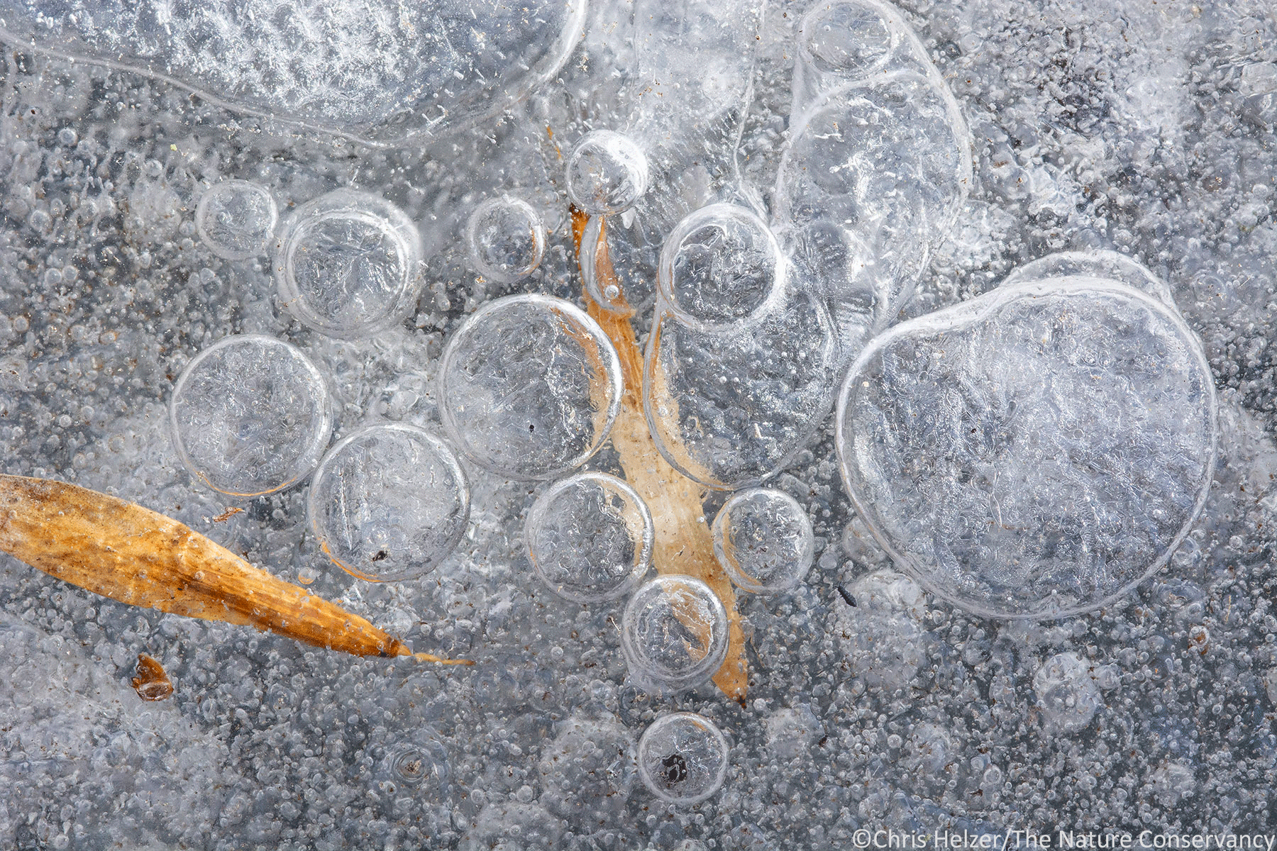 Ice bubbles and ash seeds. Nikon 105mm macro lens. ISO 400, f/14, 1/60 sec.