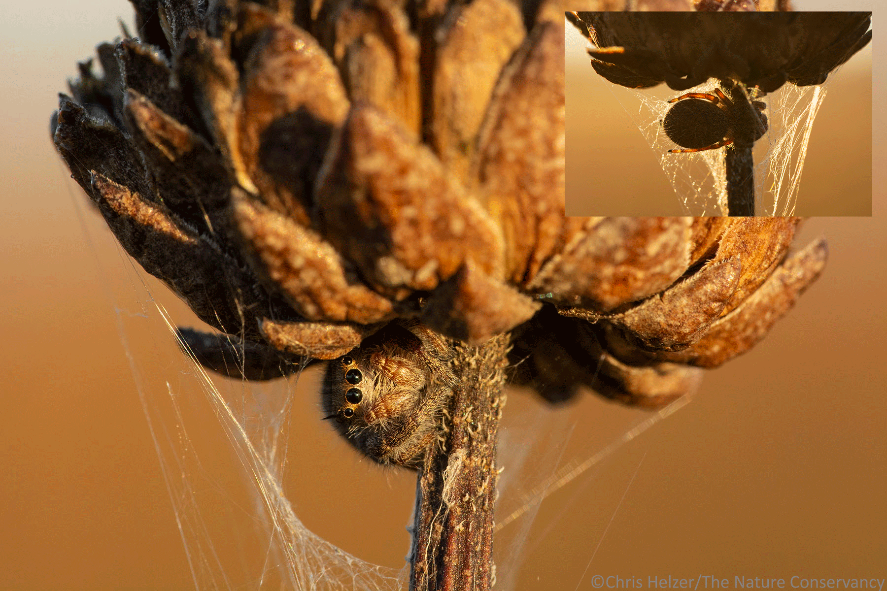 Why do jumping spiders make silken shelters at the tops of plants? The inset photo shows the same spider from a different angle.