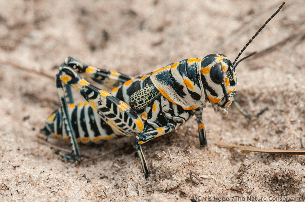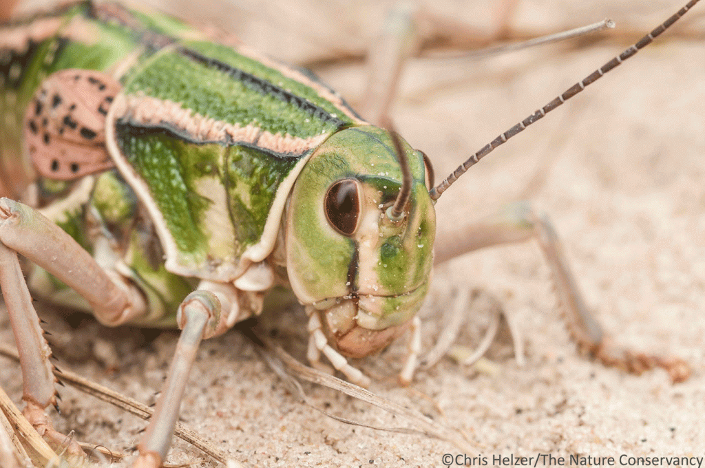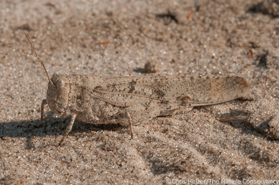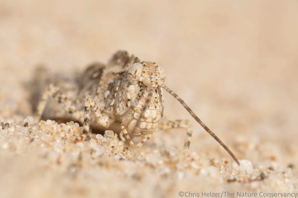 I see frequently see several species of band-winged grasshoppers in the Nebraska Sandhills. They’re particularly adept at hiding in the bare sandy patches between plants.