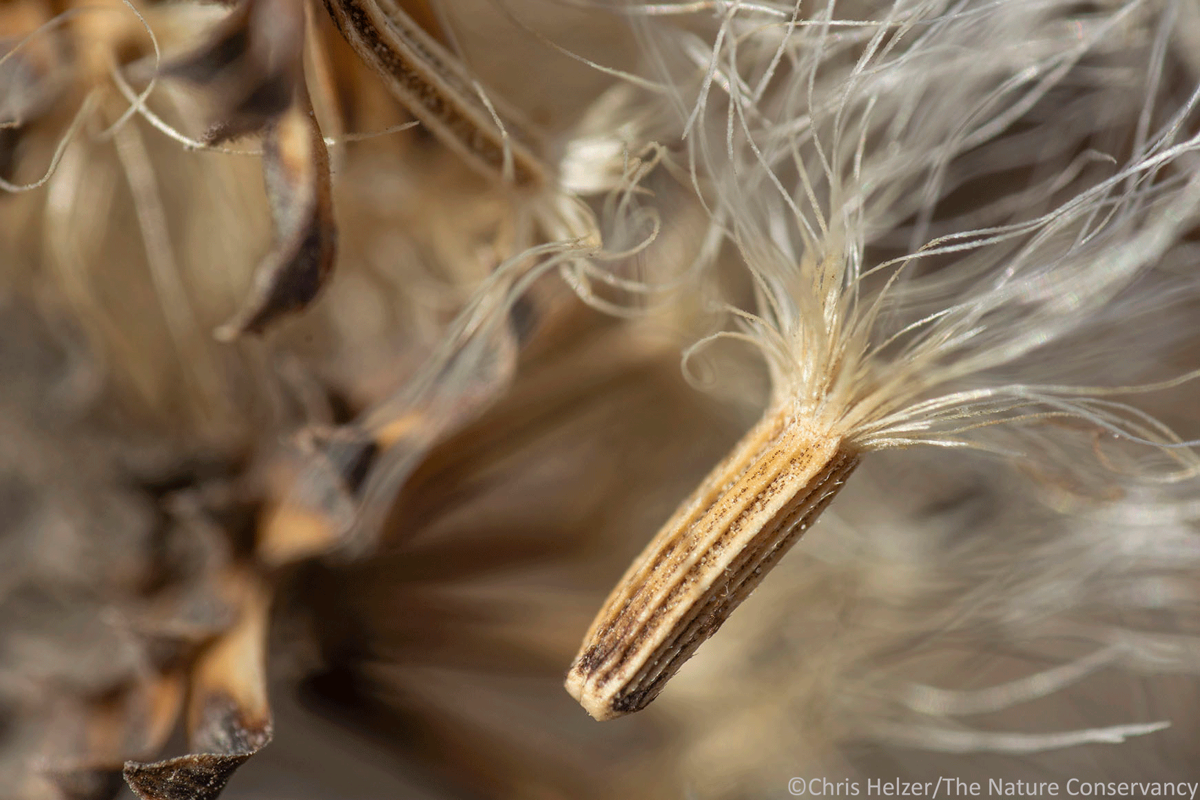 Ironweed seed (Vernonia fasciculata) at our family prairie. Nikon 105mm macro lens. ISO 400, f/16, 1/160 sec.