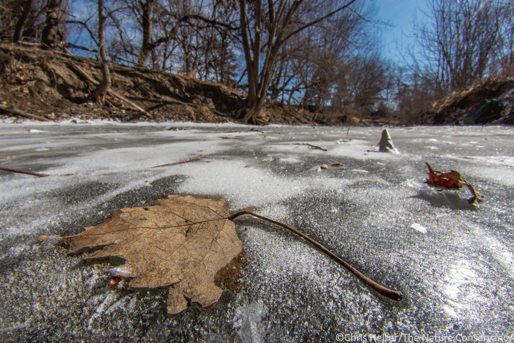 Cottonwood leaf and ice on Lincoln Creek in Aurora, NE. Nikon 10.5mm fisheye lens. ISO 400, f/22, 1/160 sec.