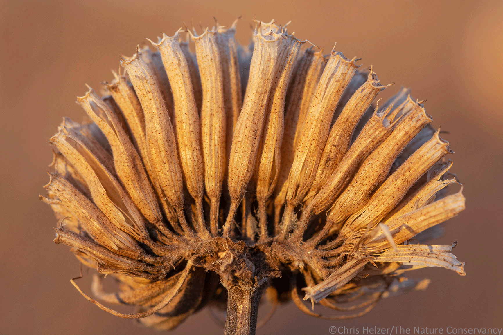 Half a head of wild bergamot (Monarda fistulosa), showing the long tubes that contain the plant’s seeds. Nikon 105mm macro lens. ISO 400, f/16, 1/60 sec.