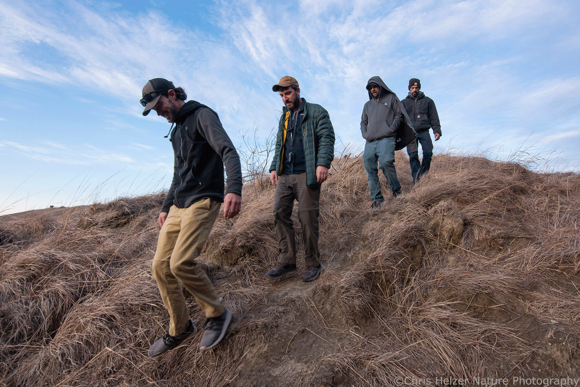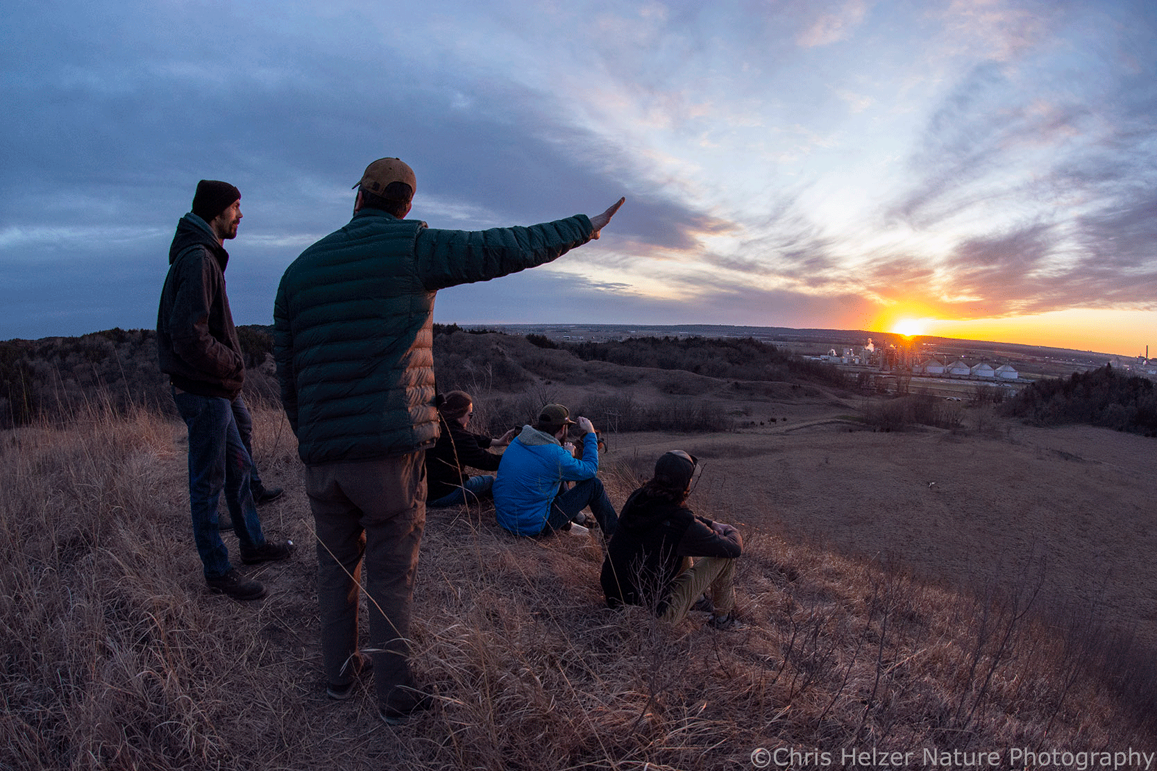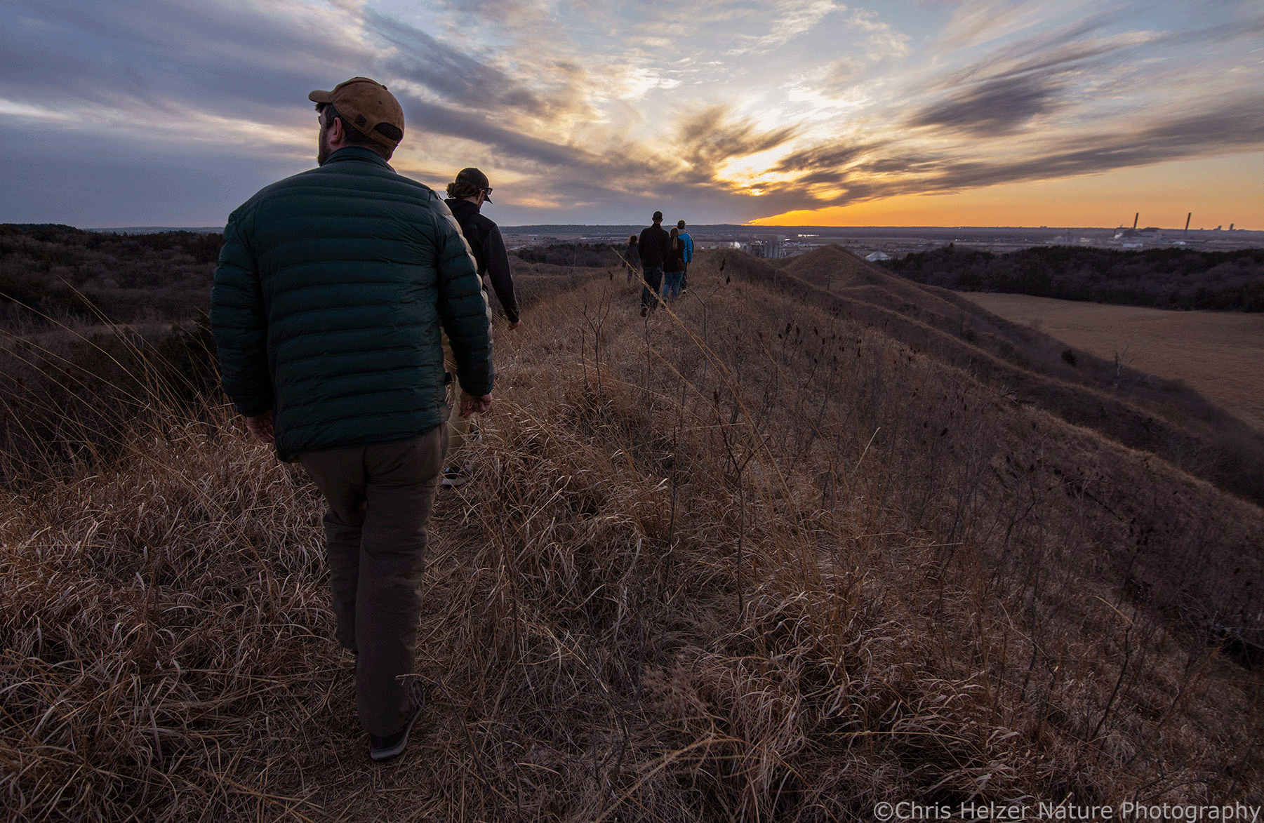 It was still a little early to see many wildflowers, but we did find a buffalo pea plant (Astragalus crassicarpus) in bloom. There were also quite a few green shoots and leaves emerging through gaps in the previous year’s leftover vegetation. We spotted some herons, turkey vultures, and a pretty sunset too. All that was nice, but it was even nicer to just climb some hills, feel the breeze on our faces, and enjoy each other’s company. Thanks, prairie, for being there for us.