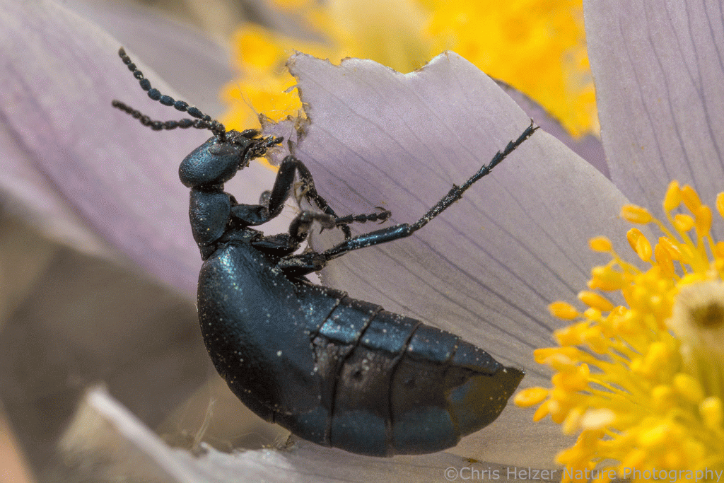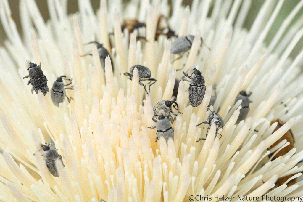 Numerous beetle species feed on flowers, eating pollen and nectar, but also petals, anthers, and other vital anatomical features. Some of these beetles can provide pollination services if they move between blossoms, but that benefit can often be outweighed by the destruction they create. Depending upon the number of beetles working over a flower, that level of destruction can be minor or catastrophic for a particular plant.