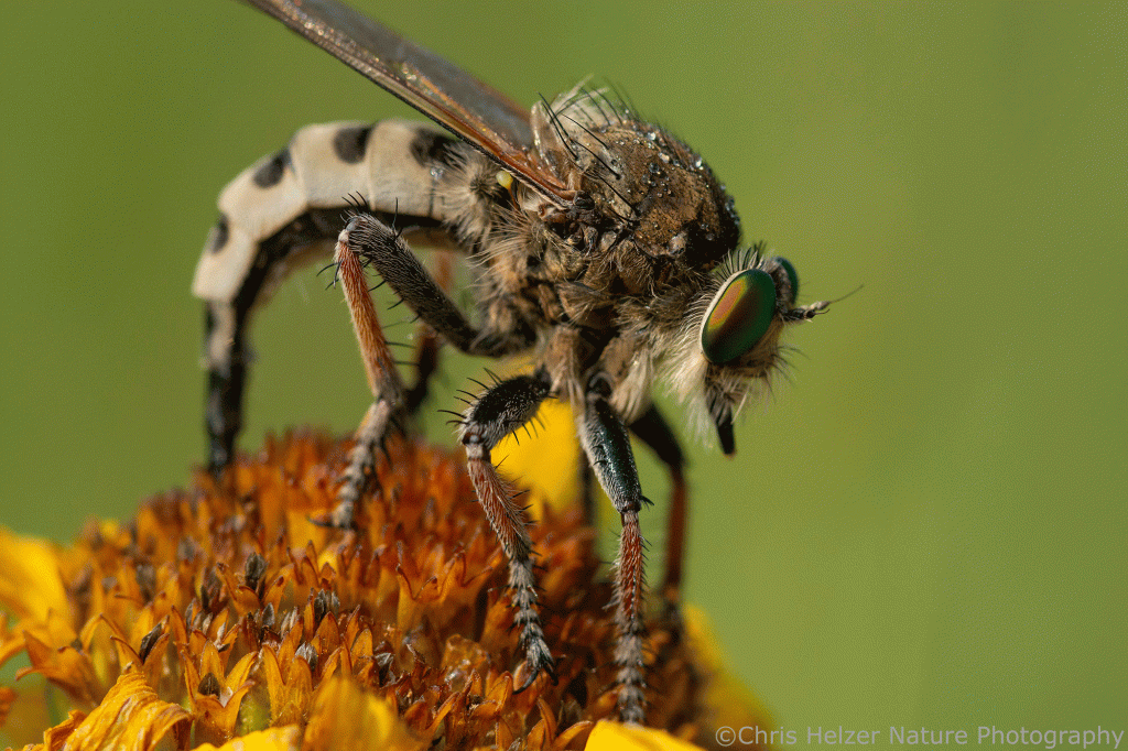 Sometimes, the way insects utilize flowers is less obvious than a big ol’ caterpillar chewing on the anthers and pollen of a sunflower. Loads of insects use flowers as a place to lay eggs, many of which hatch out and then feed on the flower – often hidden from our view. Others, like the giant robber fly pictured above, apparently lay eggs in flowers only so their larvae can drop off and burrow into the soil to chase down beetle larvae (thanks beetles!). So why do they lay their eggs in flowers and not in the soil? I have no idea.
