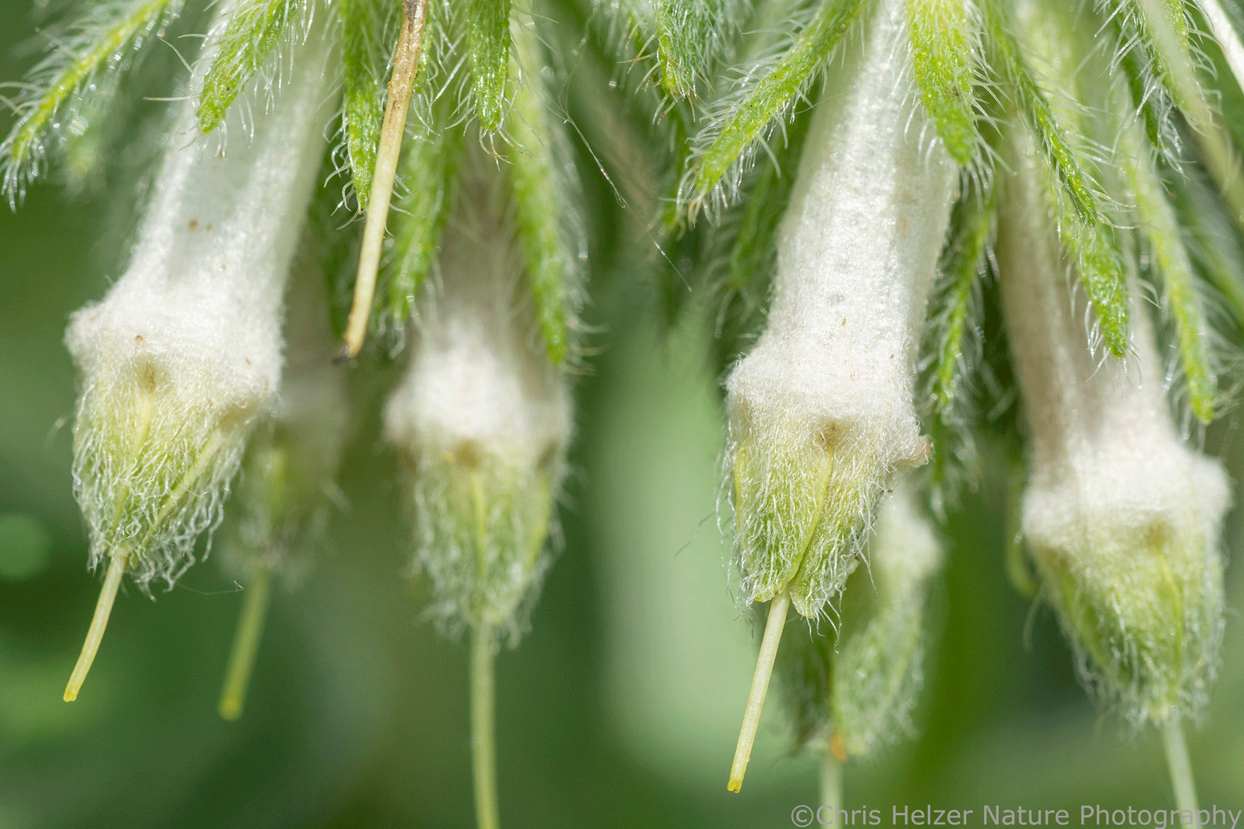 “Flowers well developed but not showy; sepals lanceolate, strigose, united at the very base; corolla tubular, 7-15 mm, with 5 erect, acute, greenish to yellowish-white lobes, without fornices; stamens inserted in the upper 1/3 of the tube, the anthers longer than the filaments, included; style long-exserted, persistent; gynobase flat.” – The Flora of Nebraska