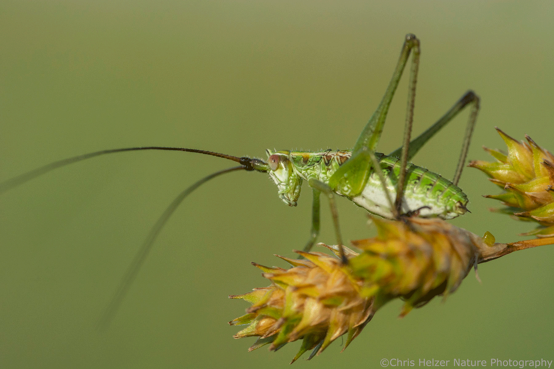 A tiny katydid nymph with antennae that stretched far beyond the frame of this image. Prairie Plains Resource Institute’s Gjerloff Prairie. Nikon 105mm macro lens. ISO 500, f/18, 1/320 sec.