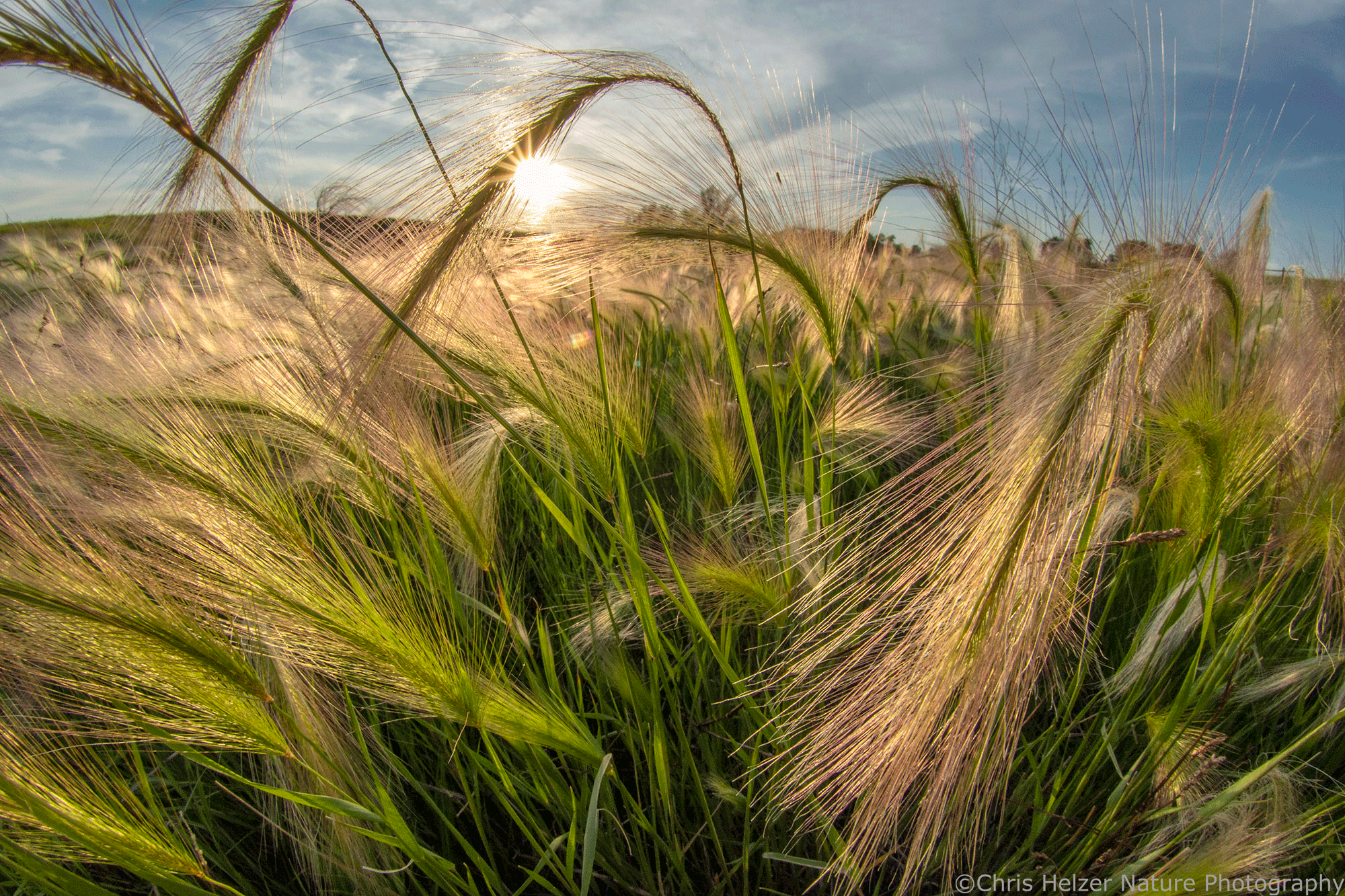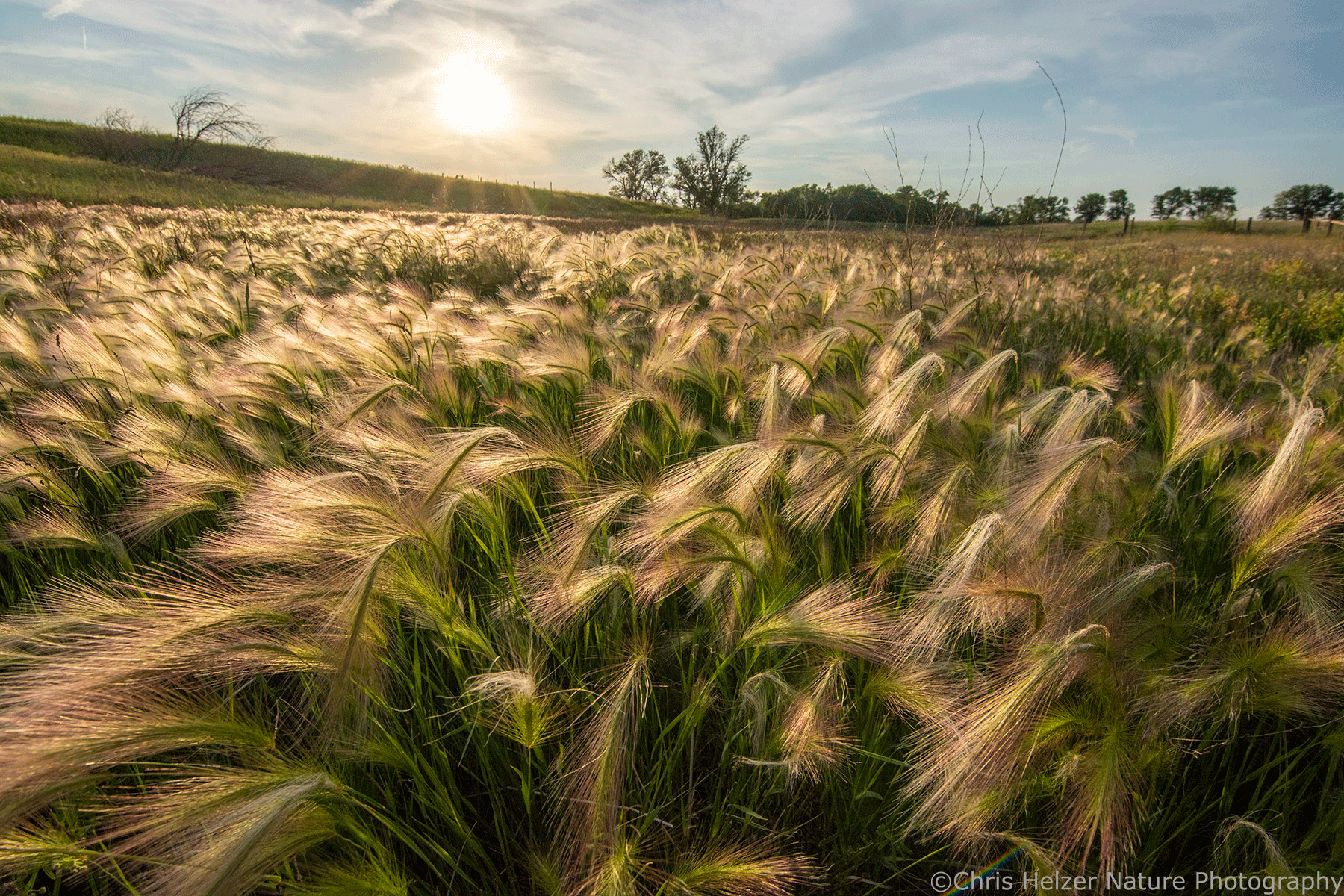 Foxtail barley and late day sun. Helzer family prairie. Nikon 10.5 fisheye lens. ISO 500, f/22, 1/160 sec.