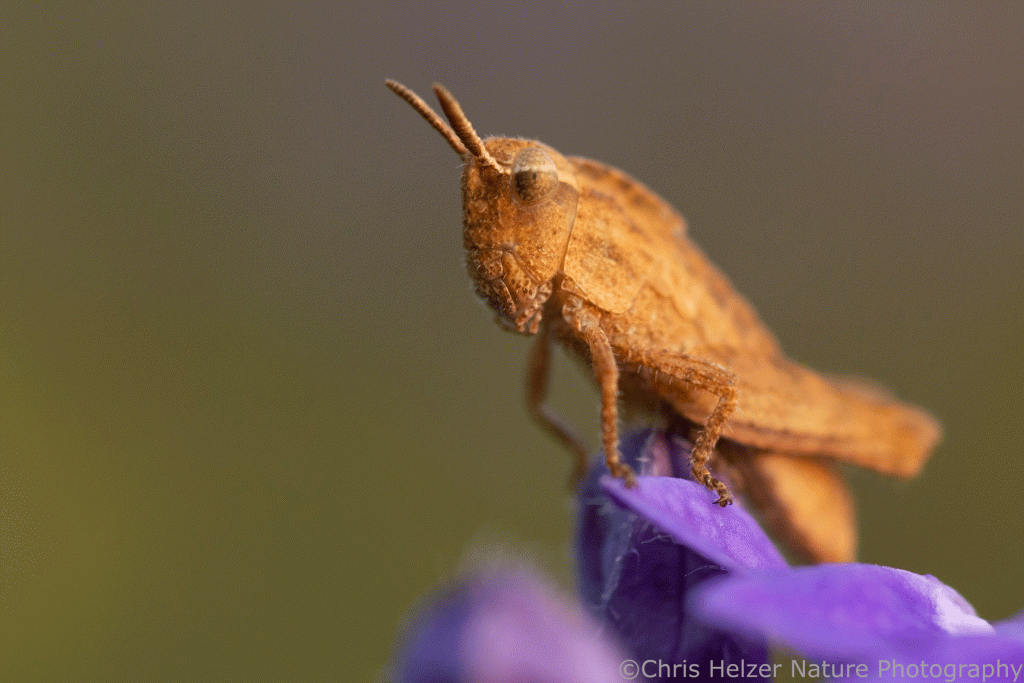 Grasshopper nymph on blue lobelia. Nikon 105mm macro lens. ISO 640, f/8, 1/250 sec.