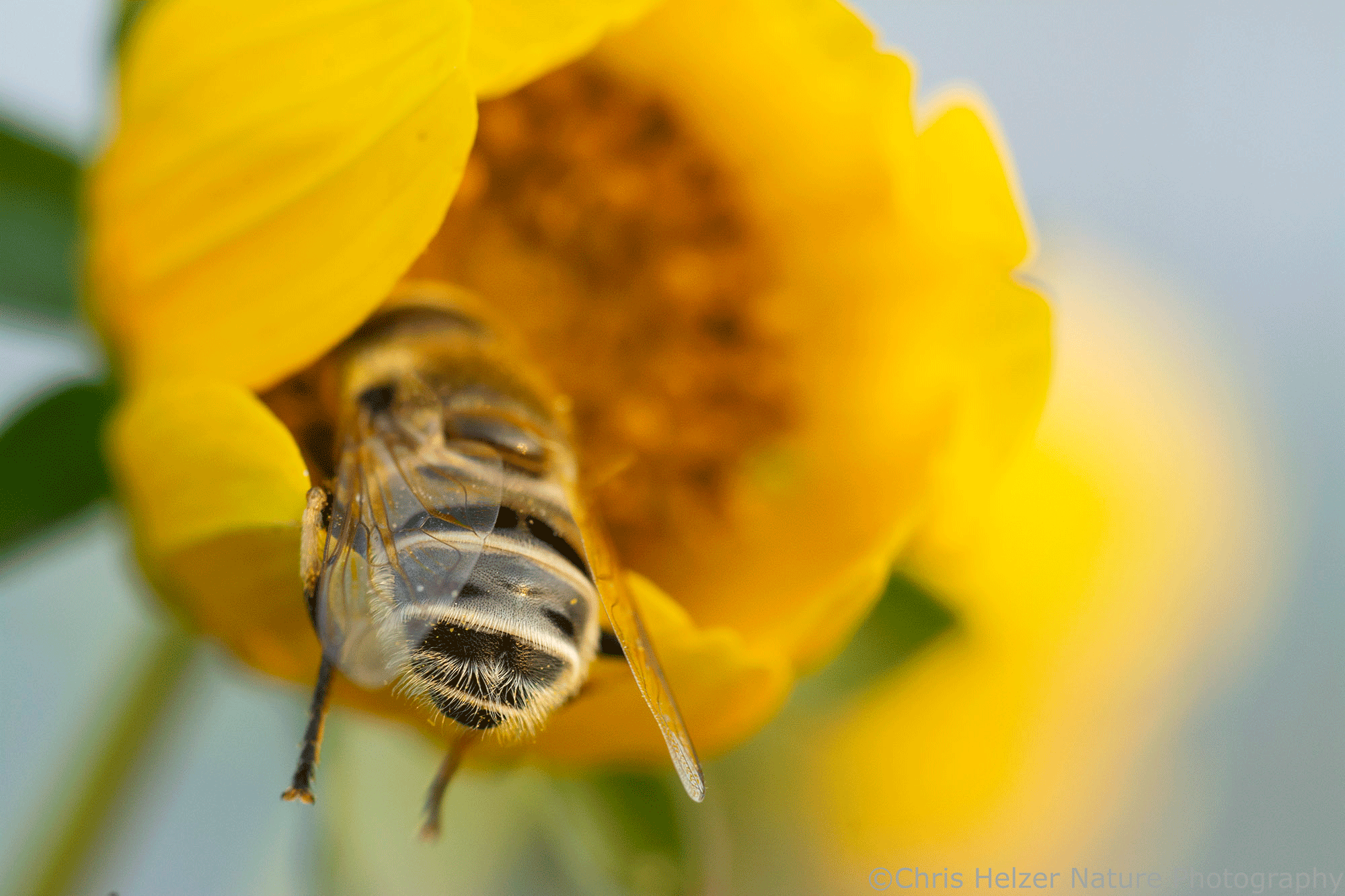 Hover fly on nodding beggarticks. Nikon 105mm macro lens. ISO 640, f/13, 1/80 sec.