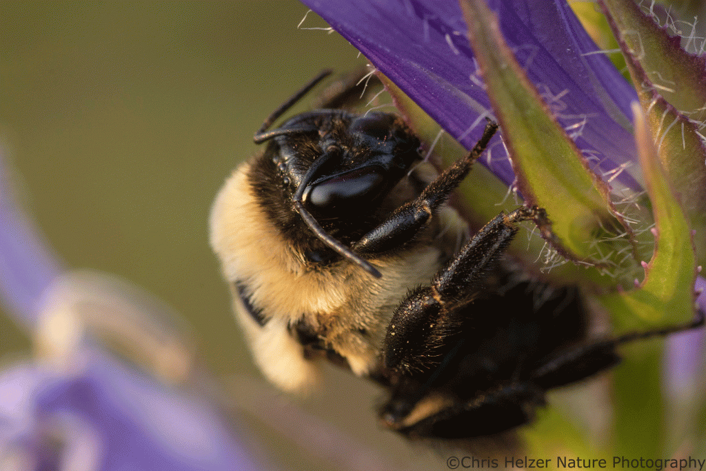 Bumble bee roosting overnight on blue lobelia. Nikon 105mm macro lens. ISO 640, f/14, 1/80 sec.