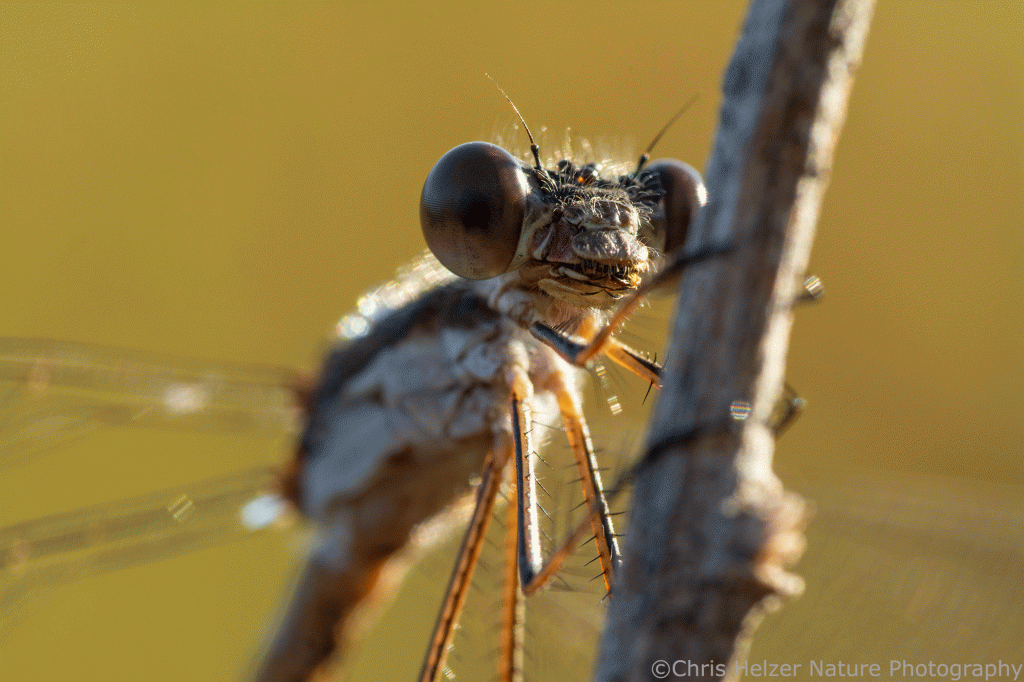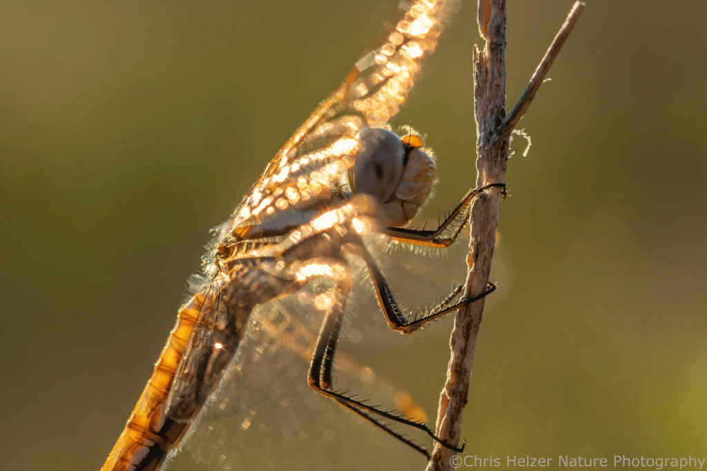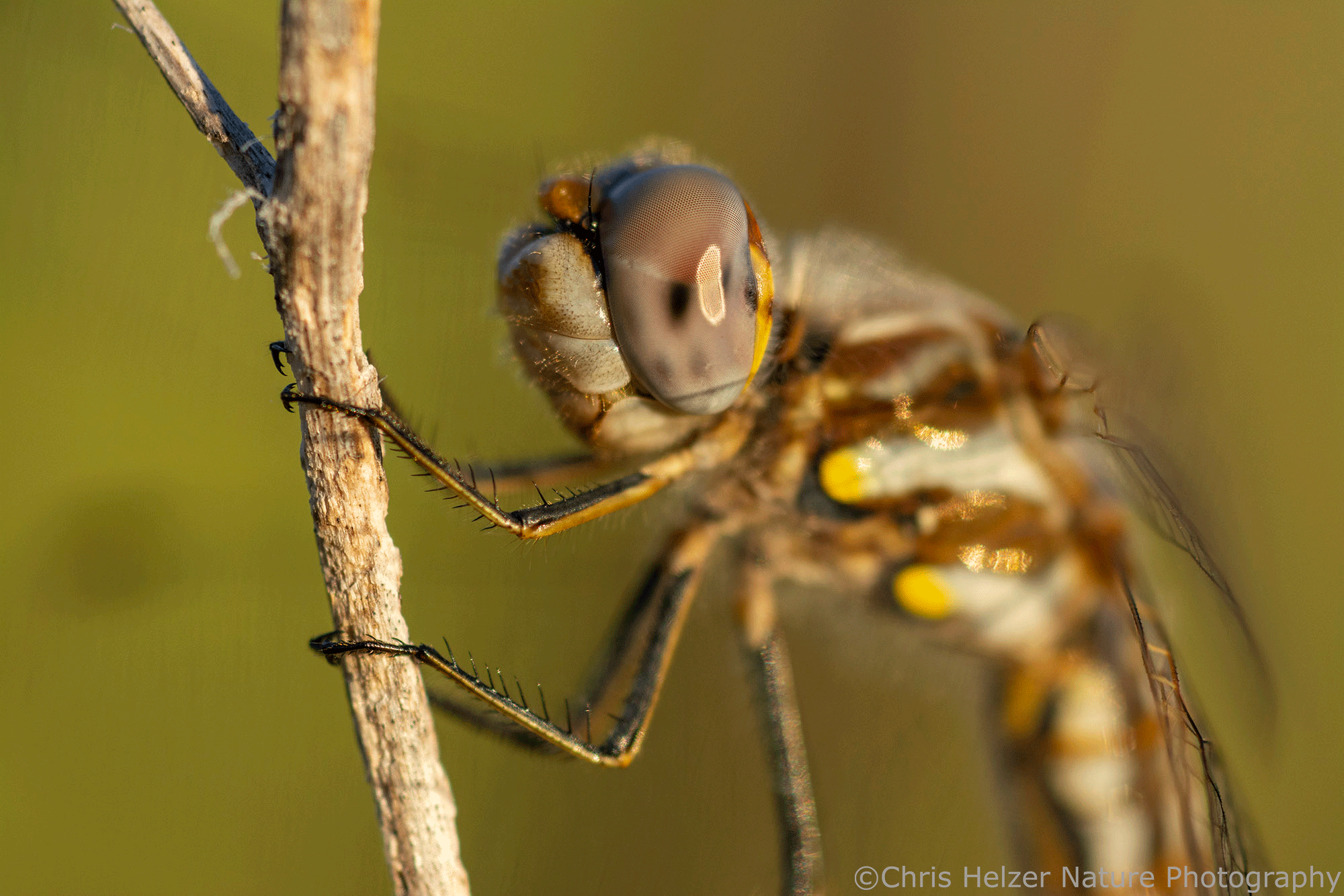 It can be helpful to experiment with lighting angles too. Since the sun isn’t moving (much), you have to move yourself and try photographing the creature with front, side, and back lighting. Below, the first three dragonfly images all show front lighting (but with subtle-but-significant differences in framing – notice how the background changes too). The fourth shows a kind of side-back lighting that is really different. Sometimes different is good (I like this one) and sometimes not, but with digital photography, what are you losing by trying?