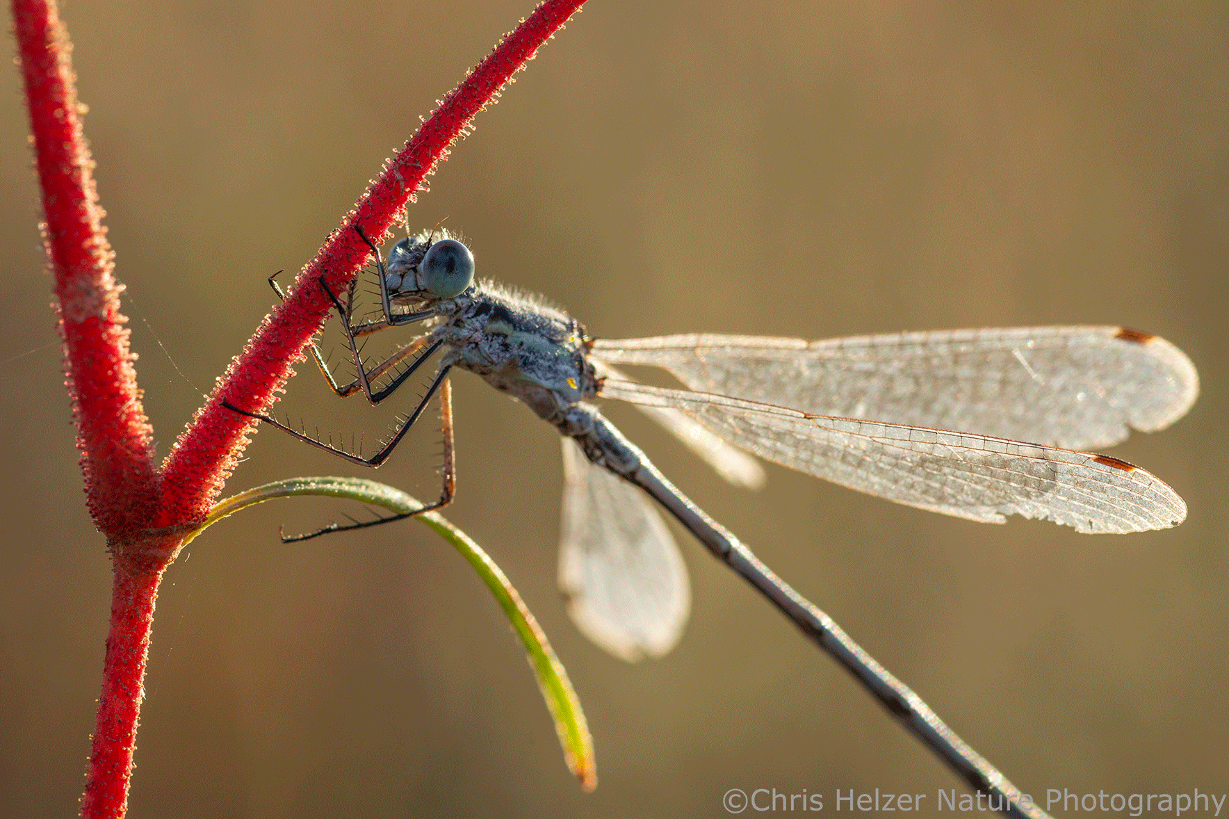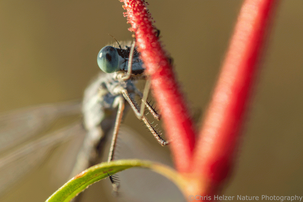 When I spotted this damselfly, I liked the blue body on the red smartweed stem. It was cool and had some dew on it but I wasn’t sure if it would sit long. As a result, I took my first picture from a comfortable distance and then edged closer and closer. Once I realized it wasn’t going to immediately fly away, I swung around to photograph its face.