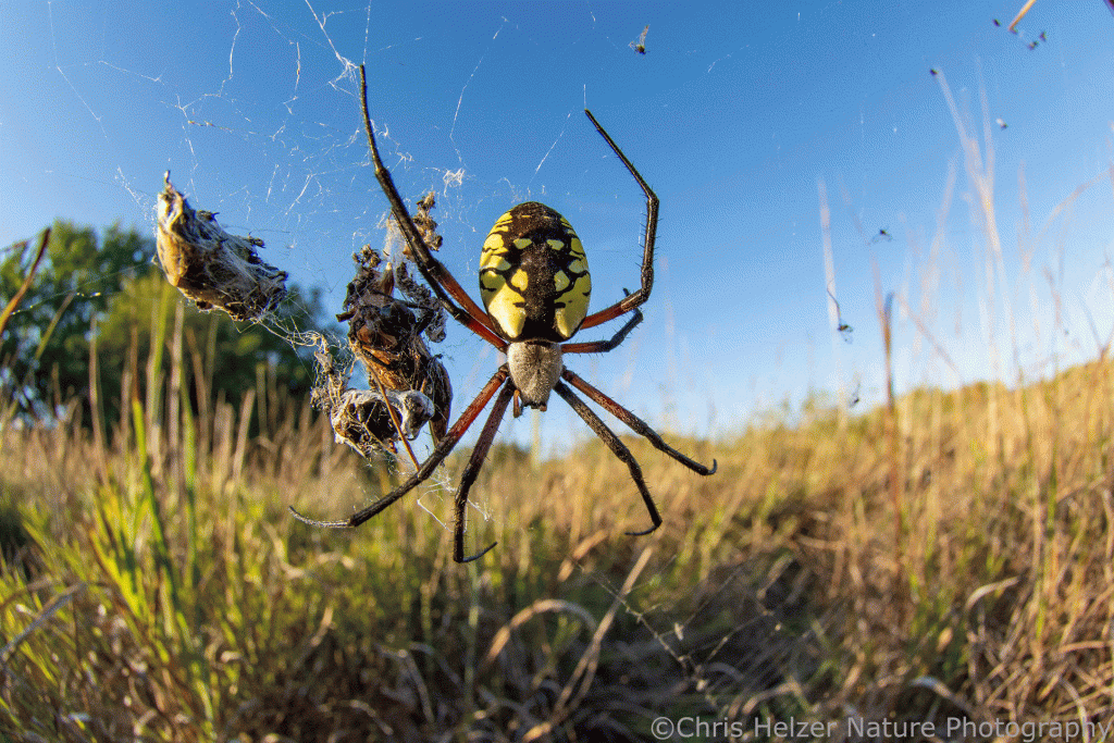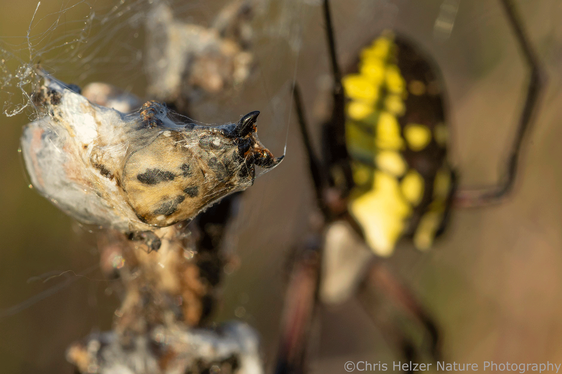 I’ve been photographing a lot of garden spiders this fall. When I saw this one, I decided to start with a fish eye lens because I thought I’d be able to show the landscape behind the spider. It worked well. But then I threw the macro lens on and worked on a few other angles that focused more on the spider and its captured prey.