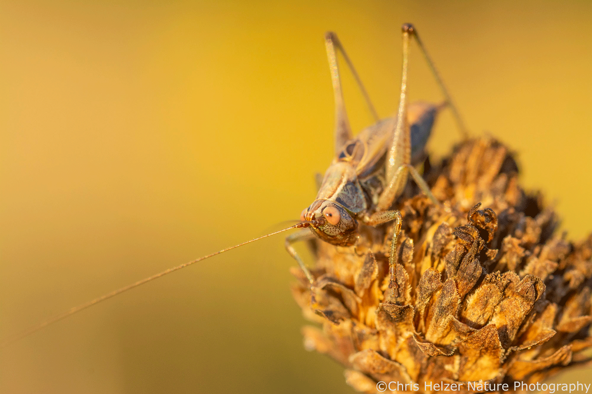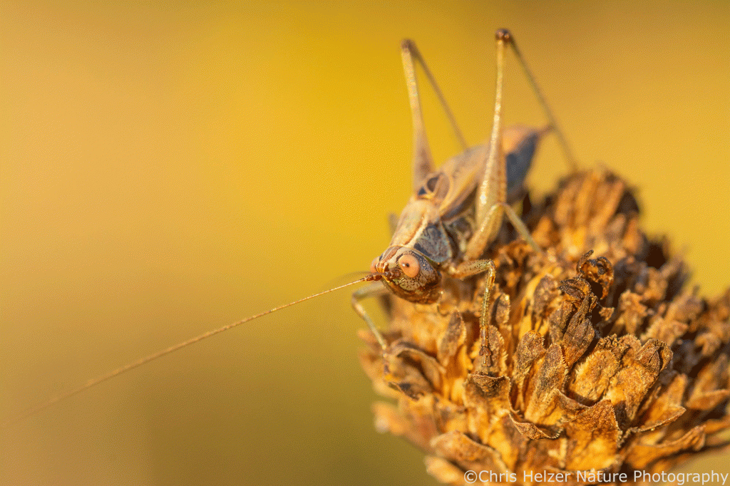 The last series shows a katydid nymph at the Platte River Prairies last week. When I first saw it, it was facing away from me and into the sun. I liked that angle, so I just went with it. I also didn’t want to swing around in front of it immediately in case that spooked it. Once I had the first photo (which I took many times to make sure I got the eye in focus), I shifted around to the other side of it. Its sunflower perch was high enough that I could easily blur out the background but I played around with that background quite a bit, especially with some goldenrod that provided some nice color. I also tried to show at least most of its long antennae while still being close enough to show the other details of its body. I think the third shot is my favorite, even though it’s not the closest. While closer is often better, sometimes the image is more about the subject plus its background than just the subject.