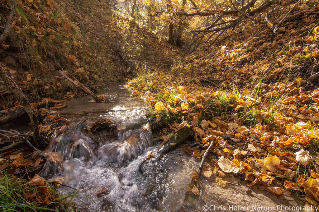 I arrived at the Niobrara Valley Preserve on Monday to help with a bison roundup. During the last two hours of my drive, the sky was covered by diffuse clouds. Since I was arriving extra early, I knew I’d have some time for photography and those clouds looked perfect for photographing autumn color in the steep-banked creeks passing through the deciduous woodland and into the river. Those creeks can be hard to photograph because they’re usually in full shade (boring light) or in strong dappled shadows (difficult contrasts to deal with). Diffuse clouds create nice even light that has some color to it. I was excited.
