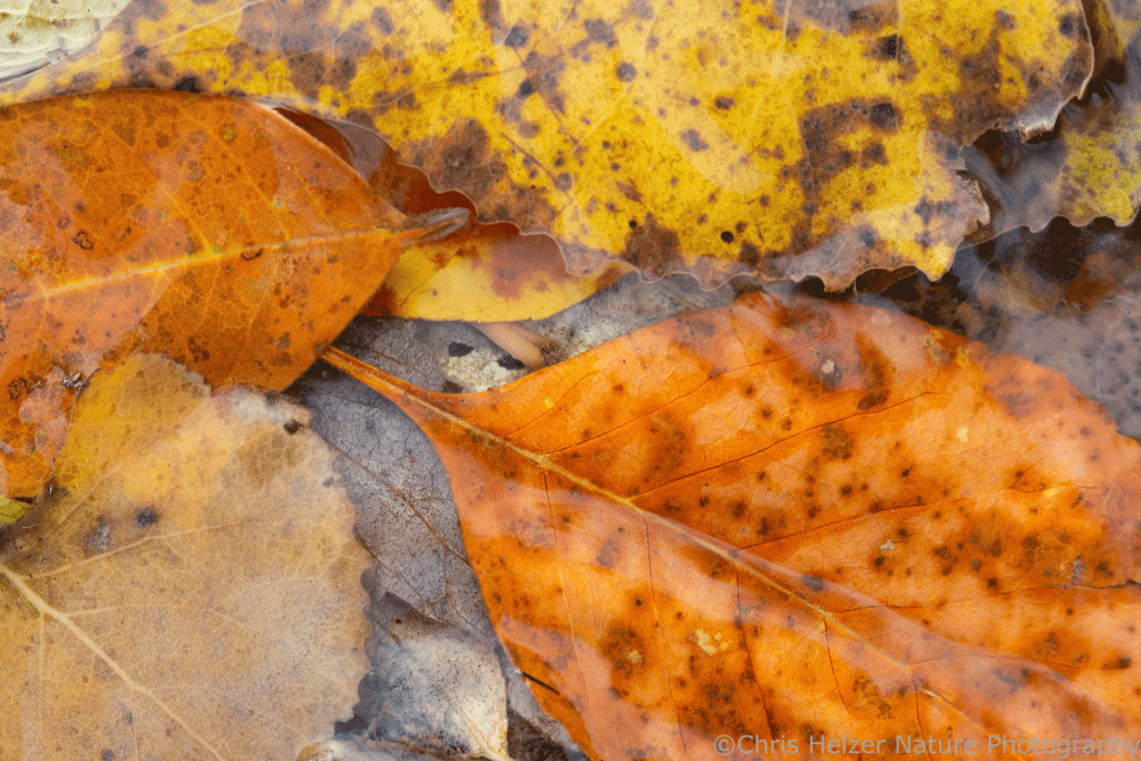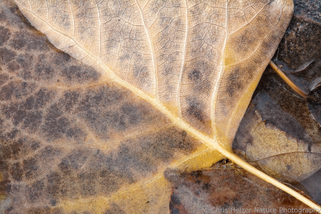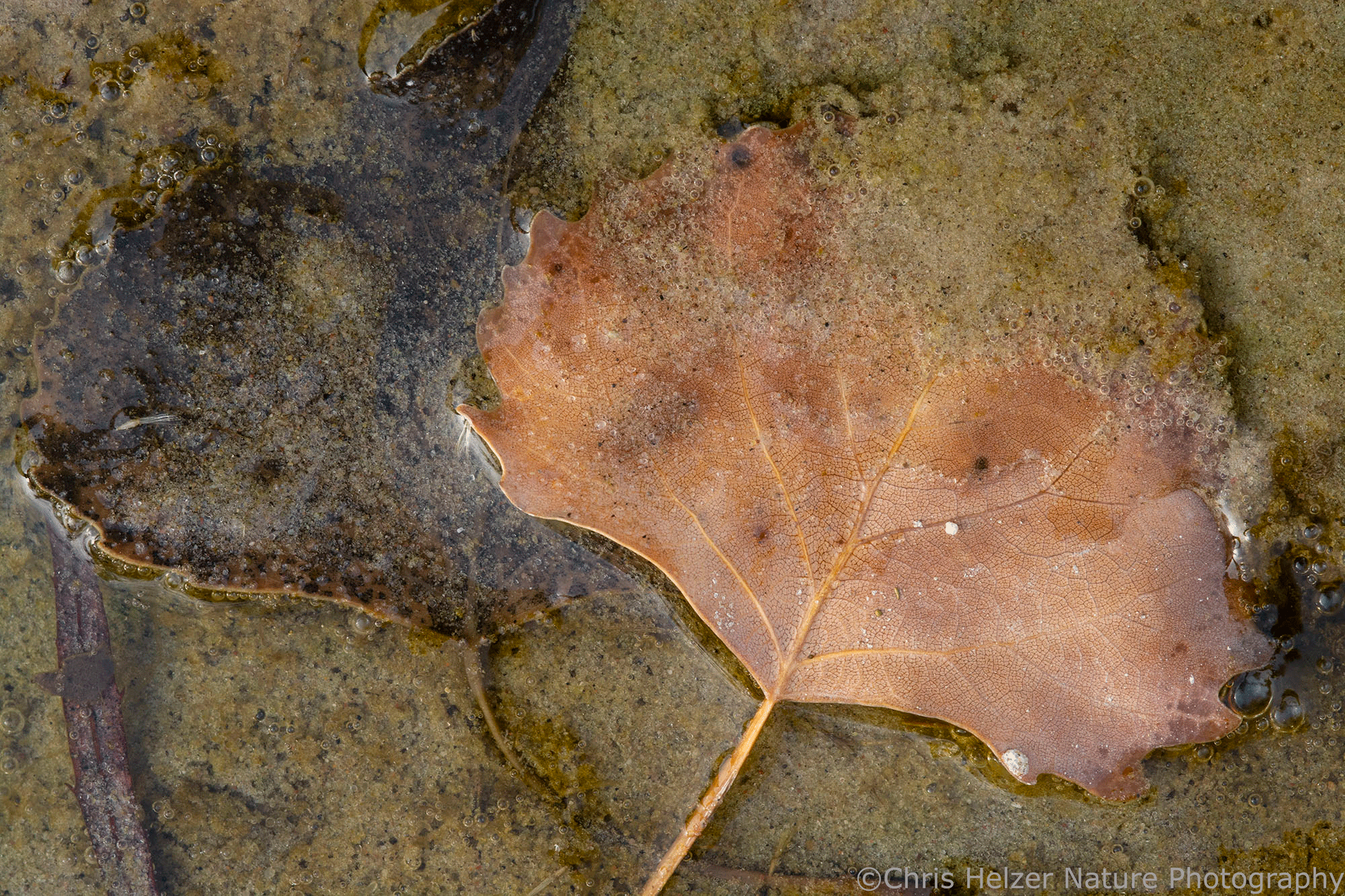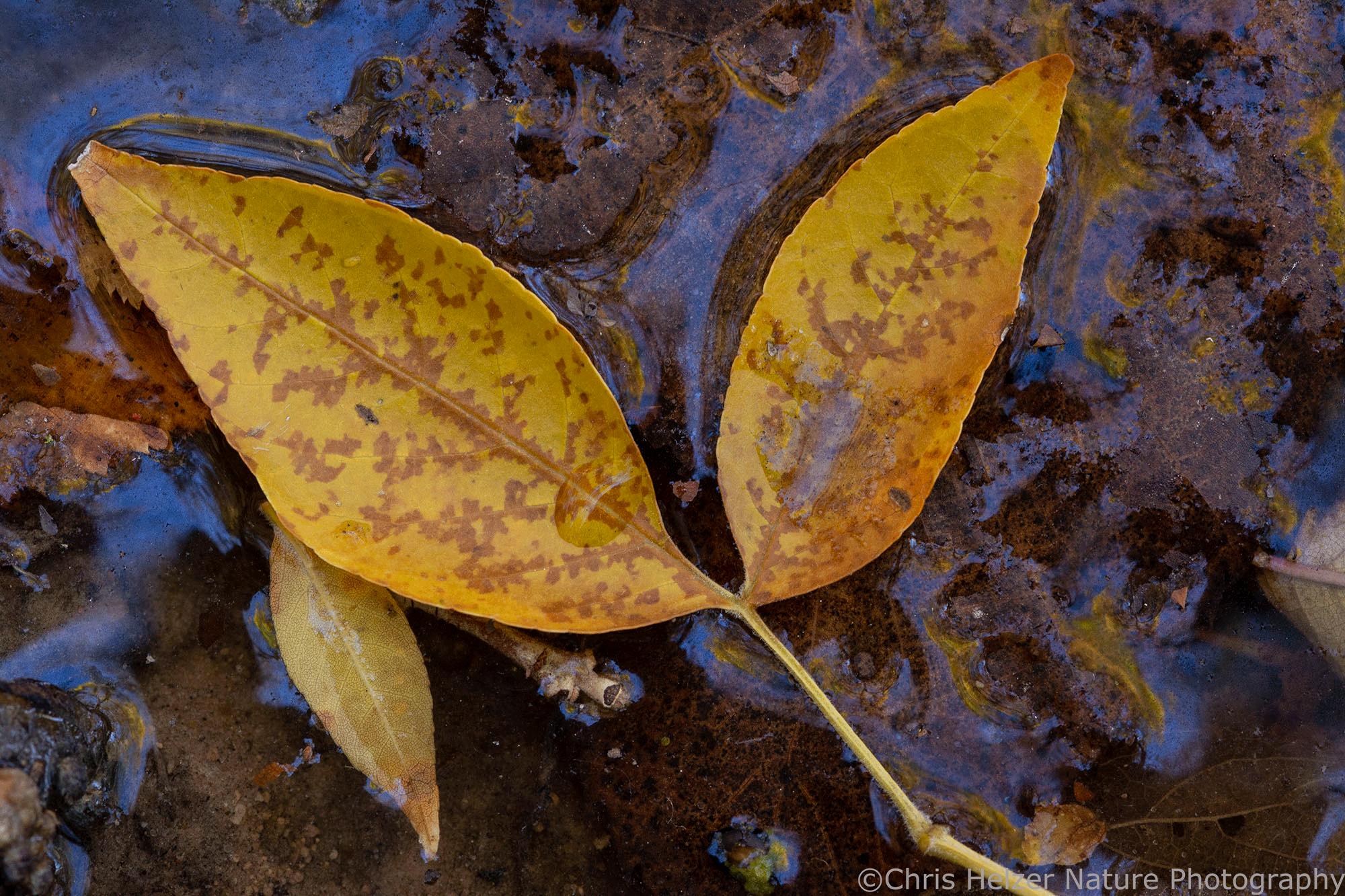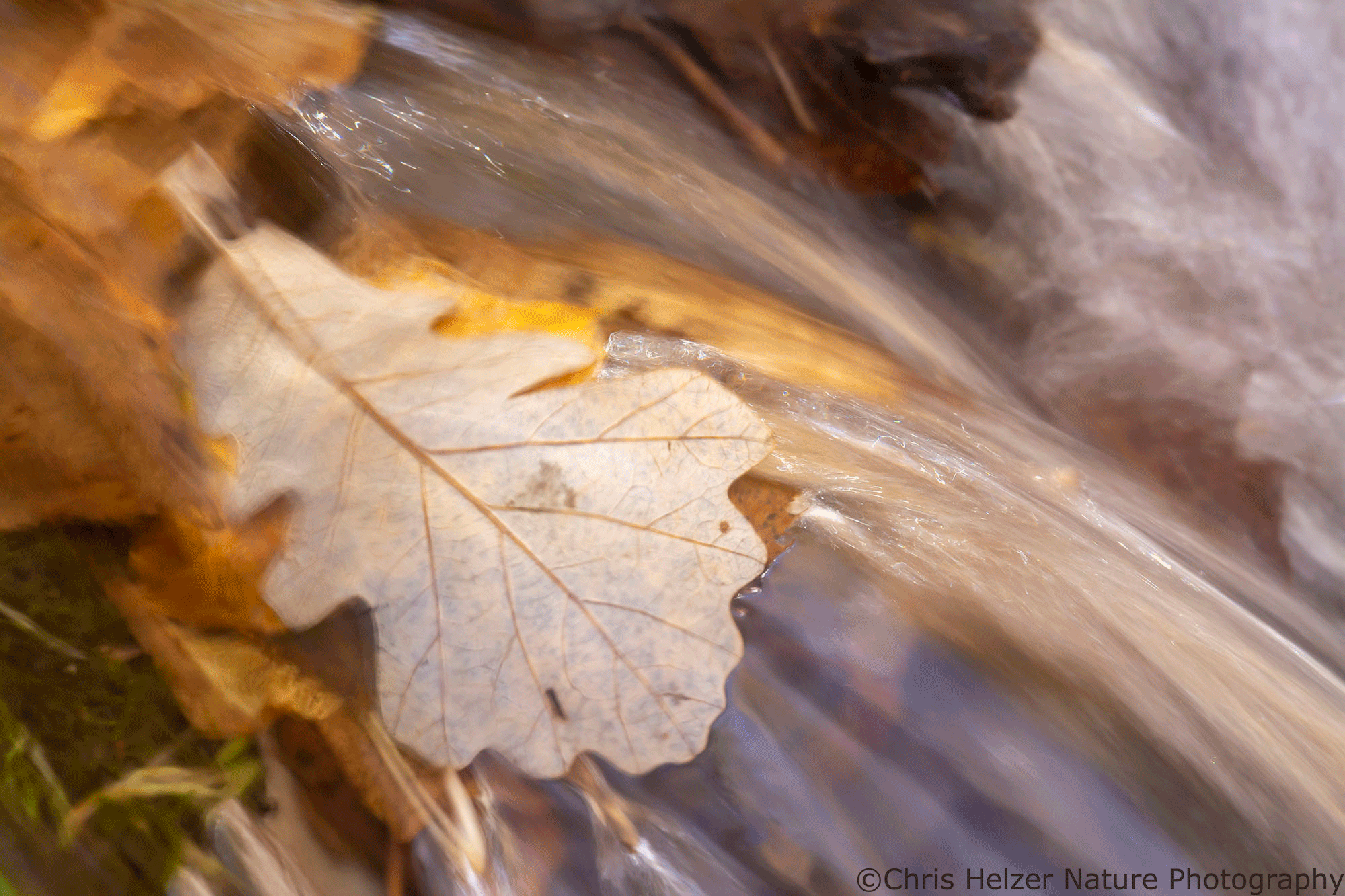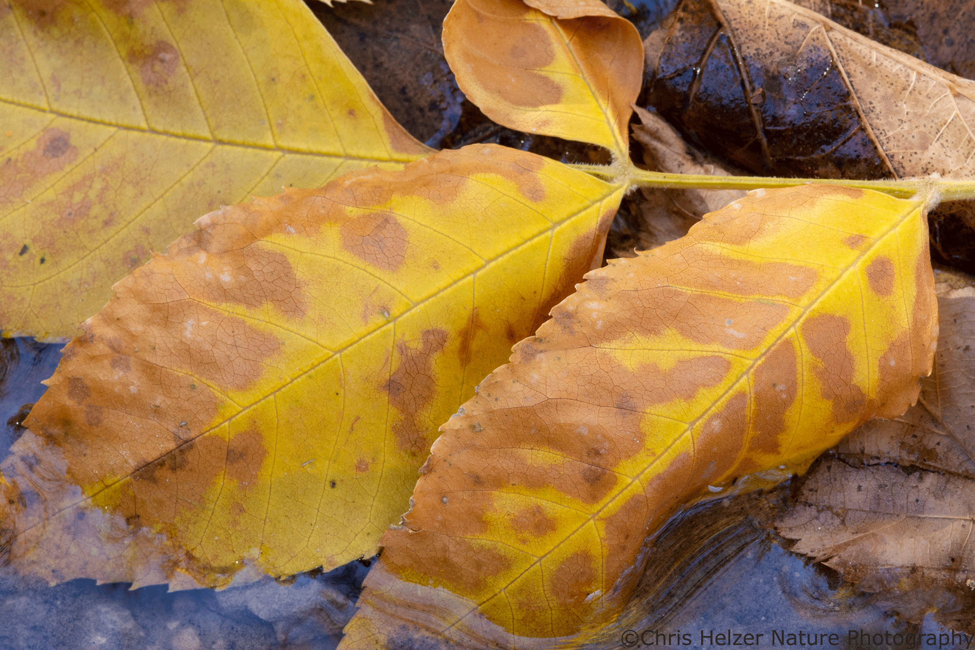 After we moved the bison into the corral Monday afternoon, I had about an hour before I needed to head back for supper. I used the opportunity to slip over to my favorite stream for autumn leaf photography. As the sun dropped, I worked up and down the stream, photographing leaves that had landed in the stream or on its wet banks.