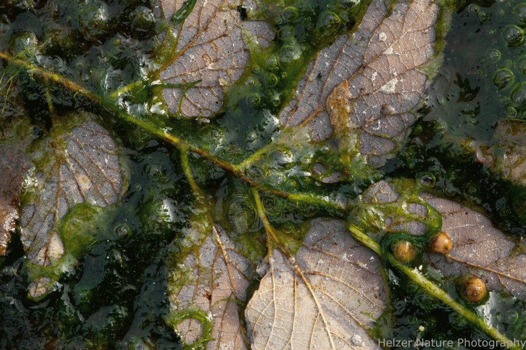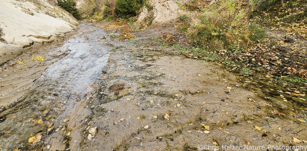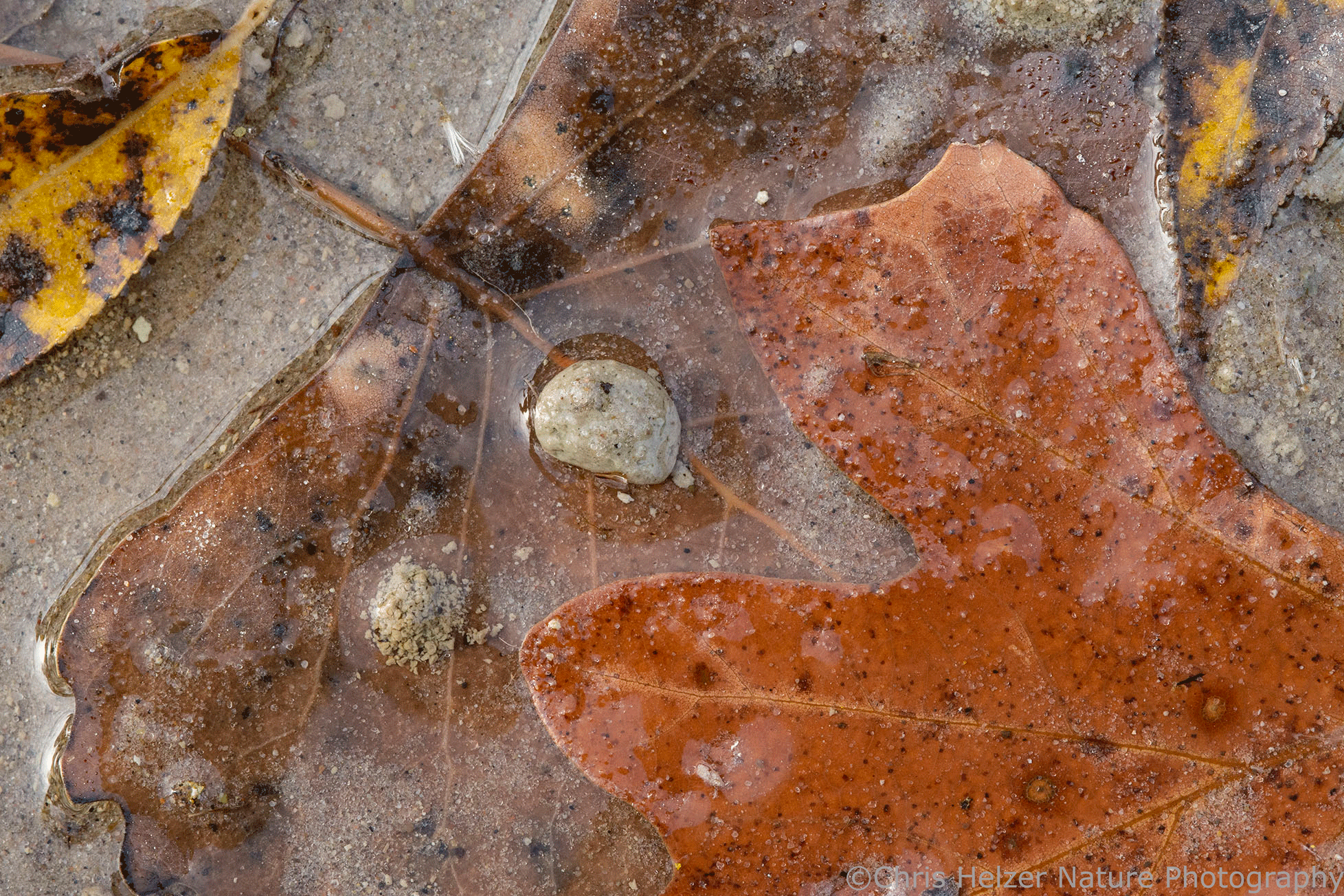 The leaves in the stream represented many distinctive Great Plains woody species. Green ash, hackberry, sandbar willow, plains cottonwood, smooth sumac, and bur oak leaves were all present. The wide sandy streambed made a terrific backdrop for the leaves, especially where there was a skiff of groundwater from seeps and springs, as well as patches of green algae.