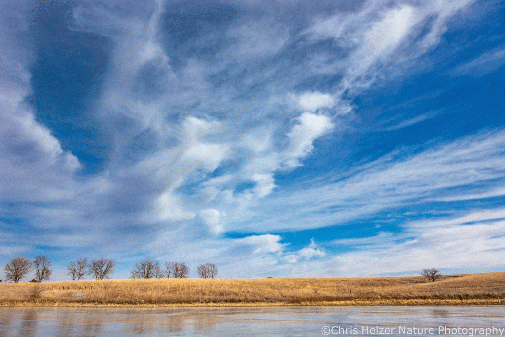 Here are some clouds I photographed last January over the pond at our family prairie, just south of Aurora. These kinds of skies always make me think of Ernie.