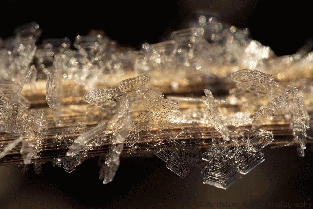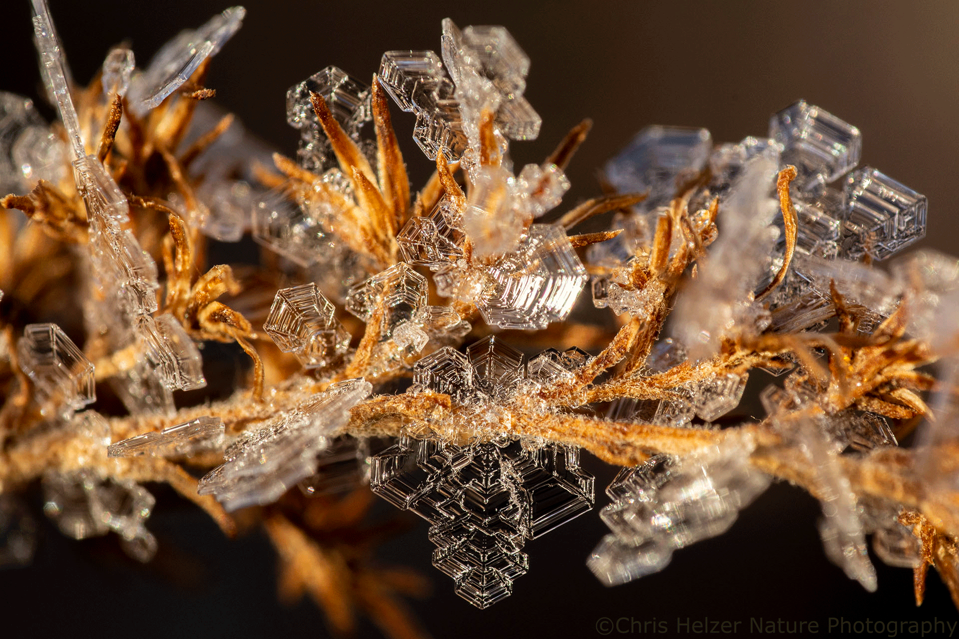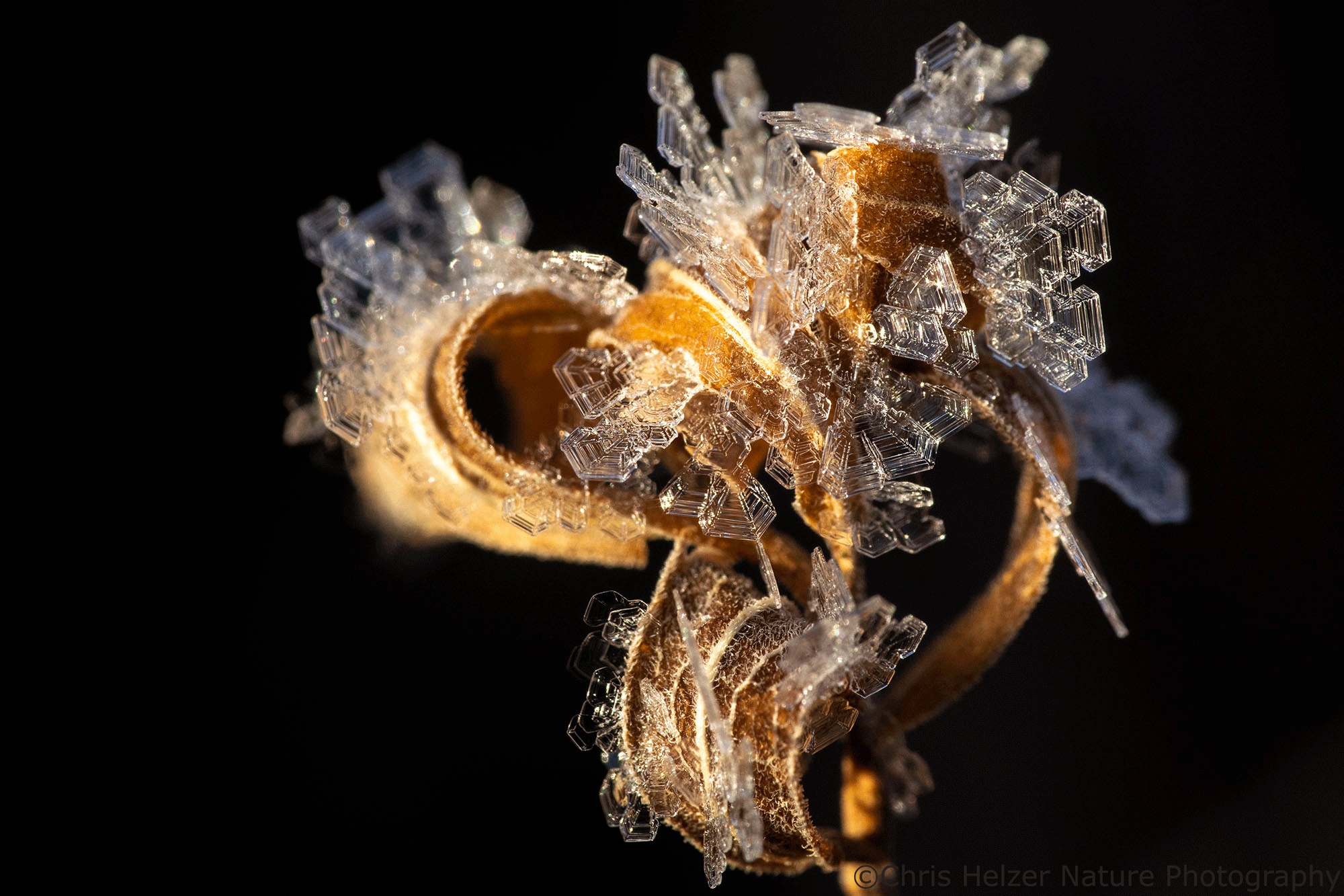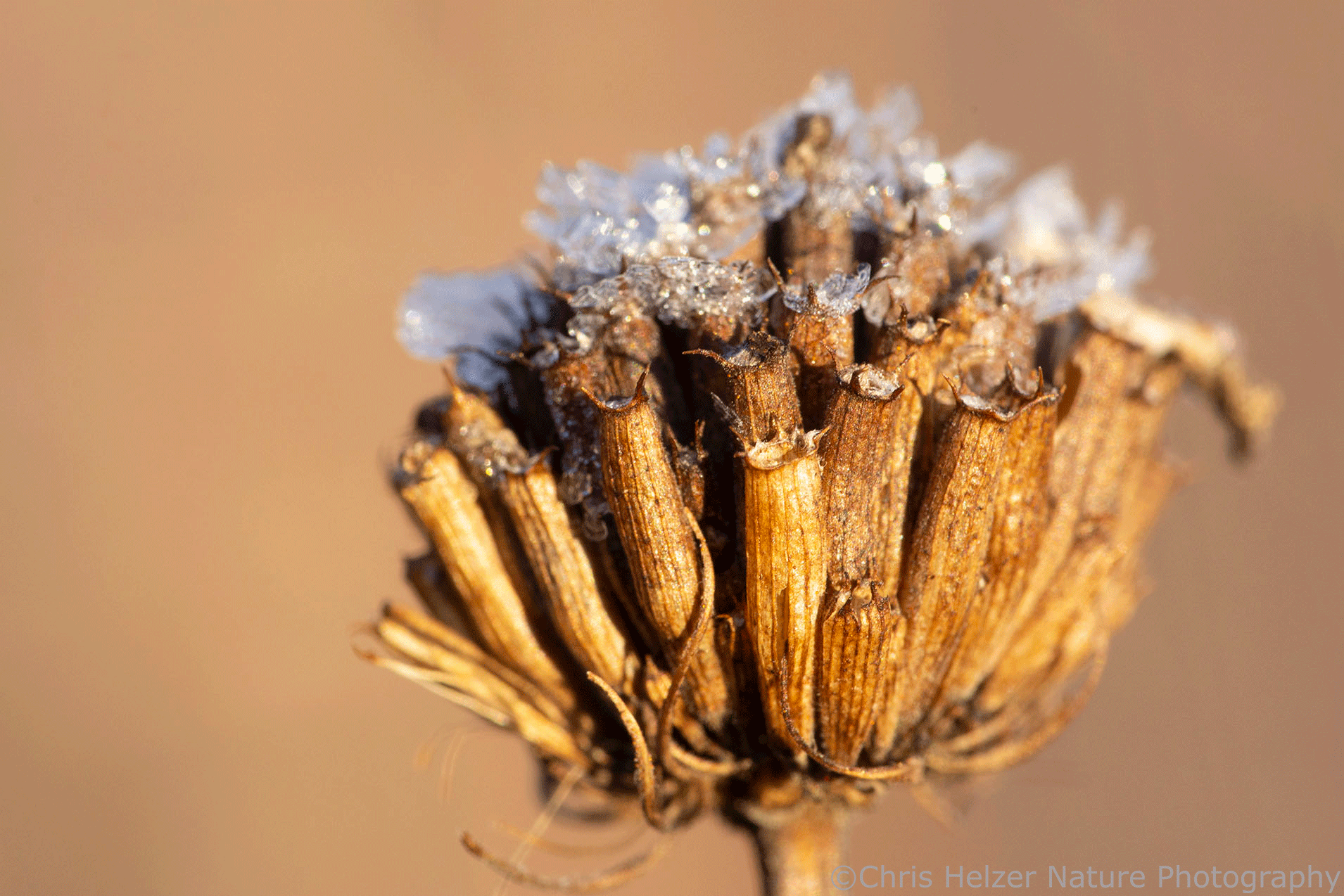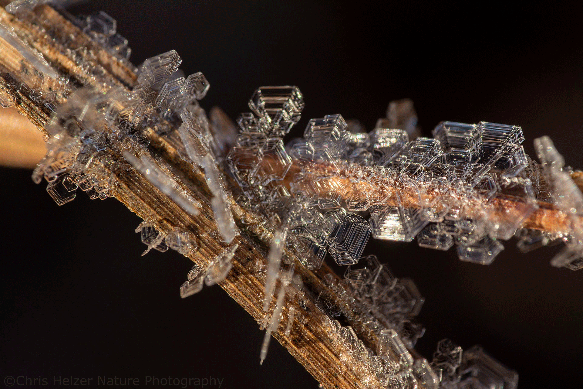 Frost crystals on goldenrod. Nikon 105mm macro lens. ISO 500, f/18, 1/160 sec.