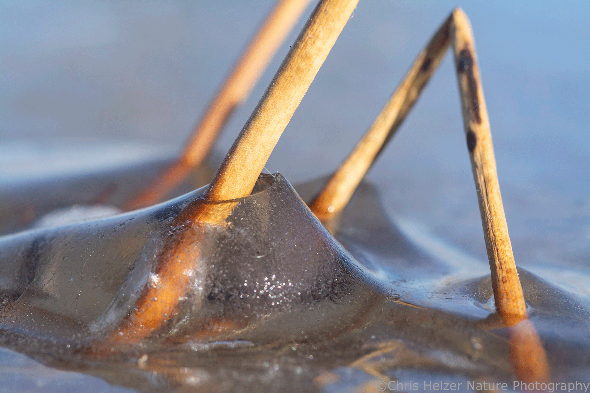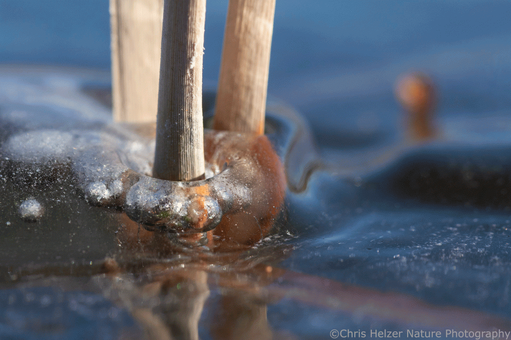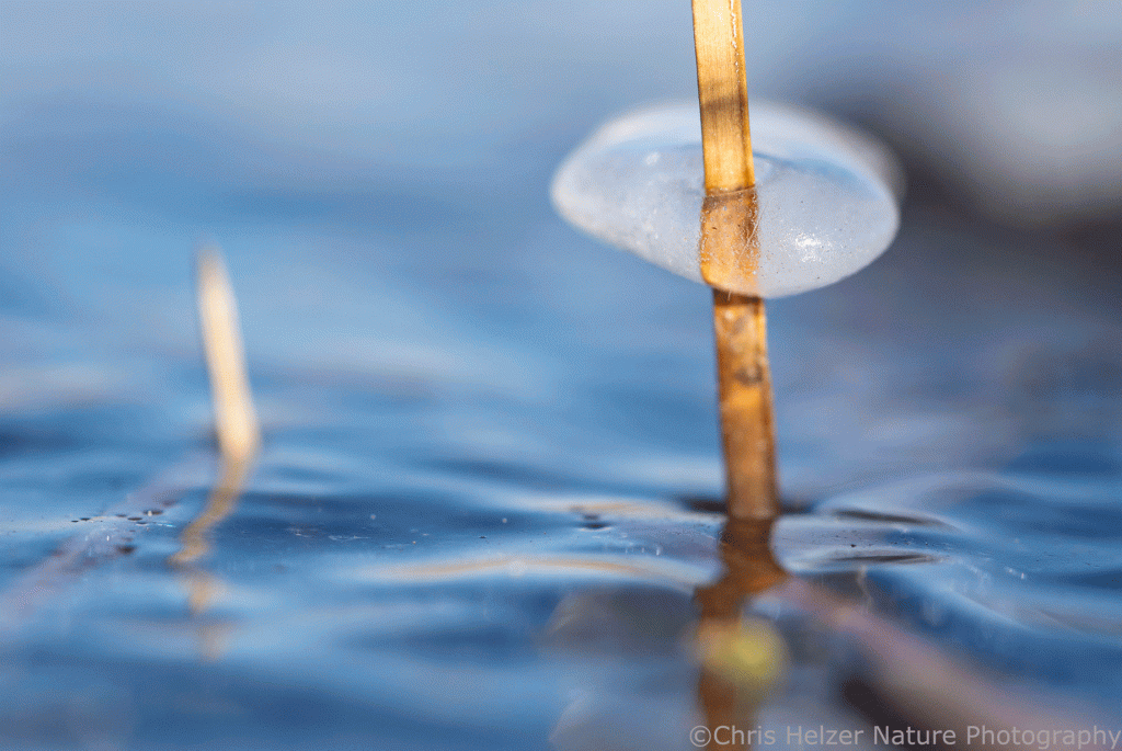 Ice on a rush sticking out of the frozen surface. Nikon 105mm macro lens. ISO 500, f/18, 1/160 sec.