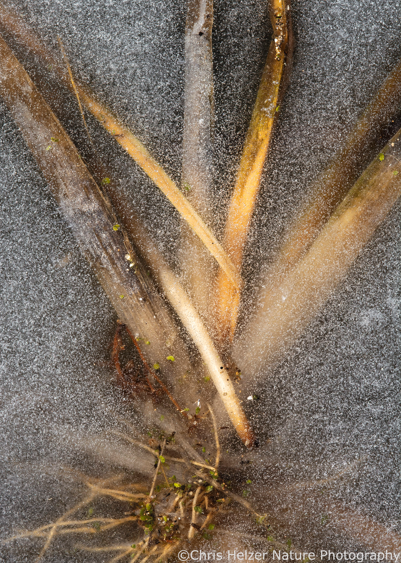 An rush that was uprooted and embedded in ice. Nikon 105mm macro lens. ISO 500, f/18, 1/125 sec.
