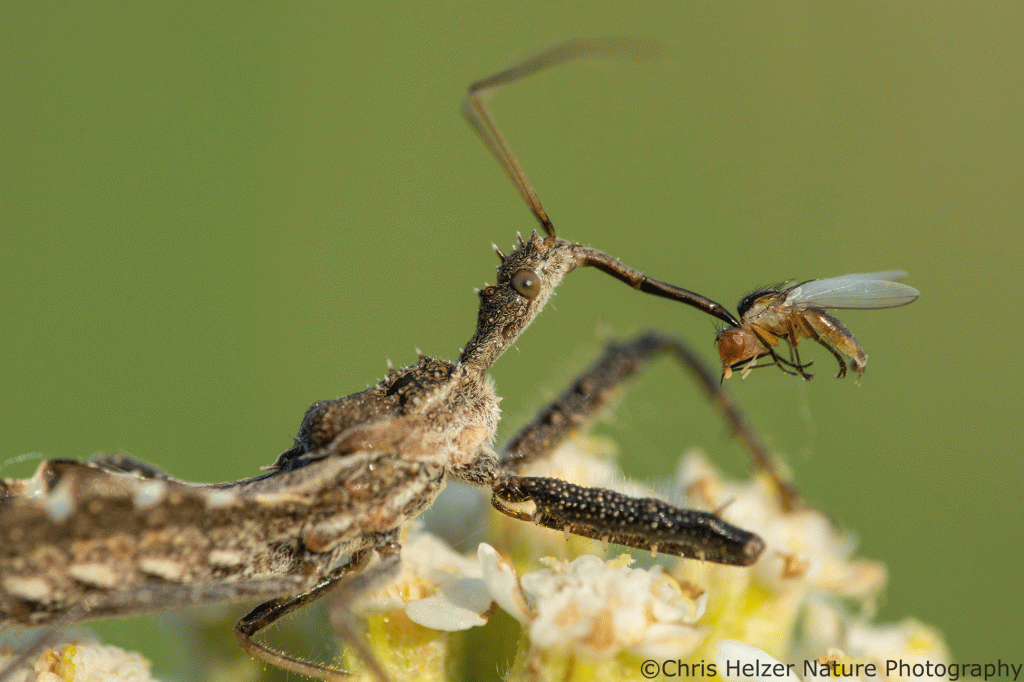 This fantastic assassin bug managed to capture and then impale this tiny fly immaculately, hitting the sweet spot between head and thorax with precision. It then injected a paralyzing venom that also “pre-digested” the fly’s insides, allowing the bug to just slurp its meal out of the remaining fly husk. You might say the assassin bug got its award and the fly went to its reward. Or you might not.