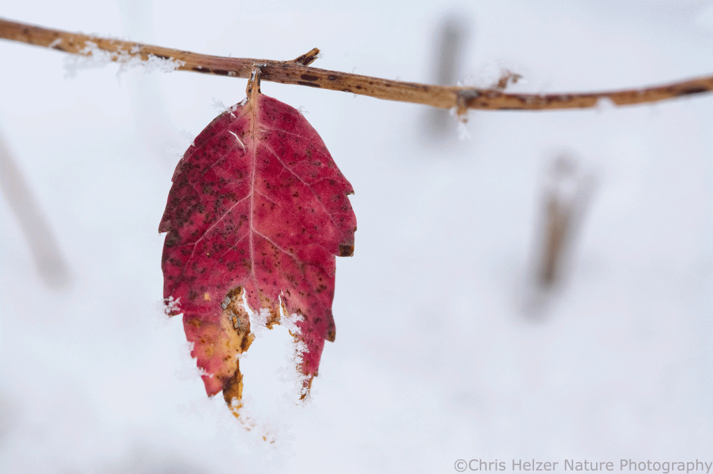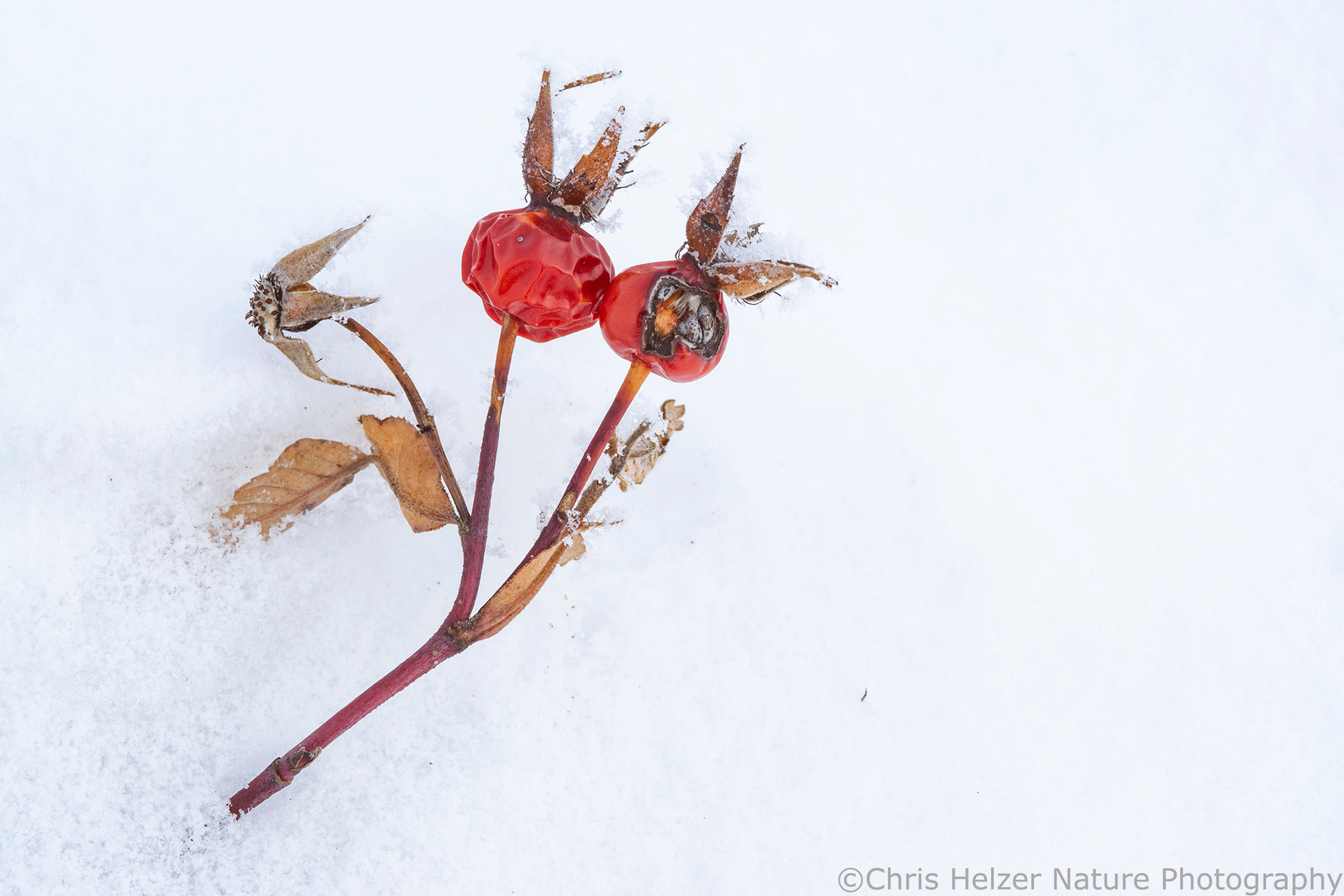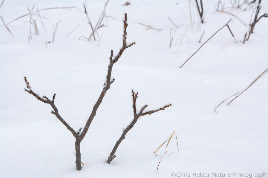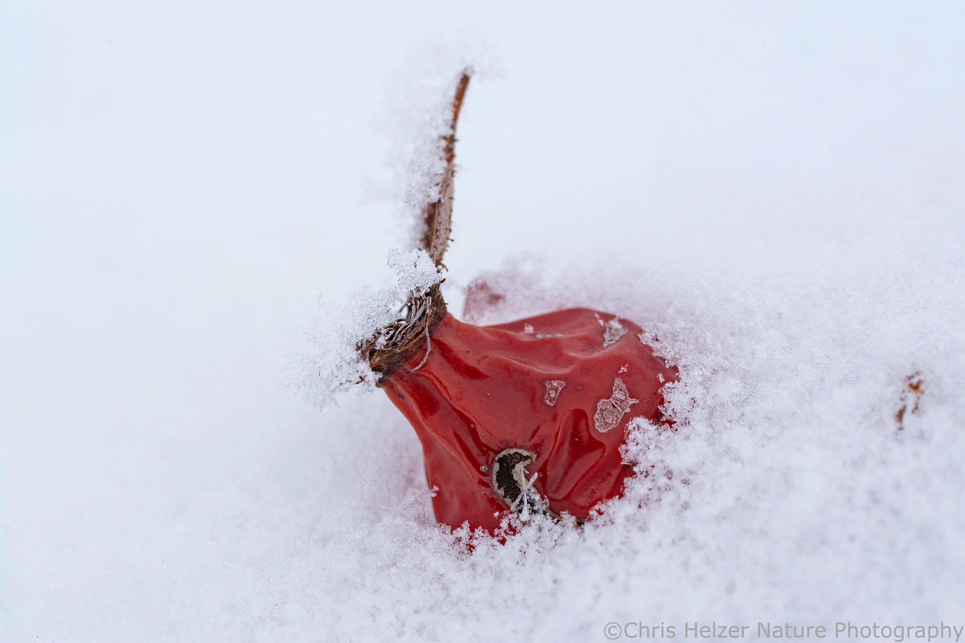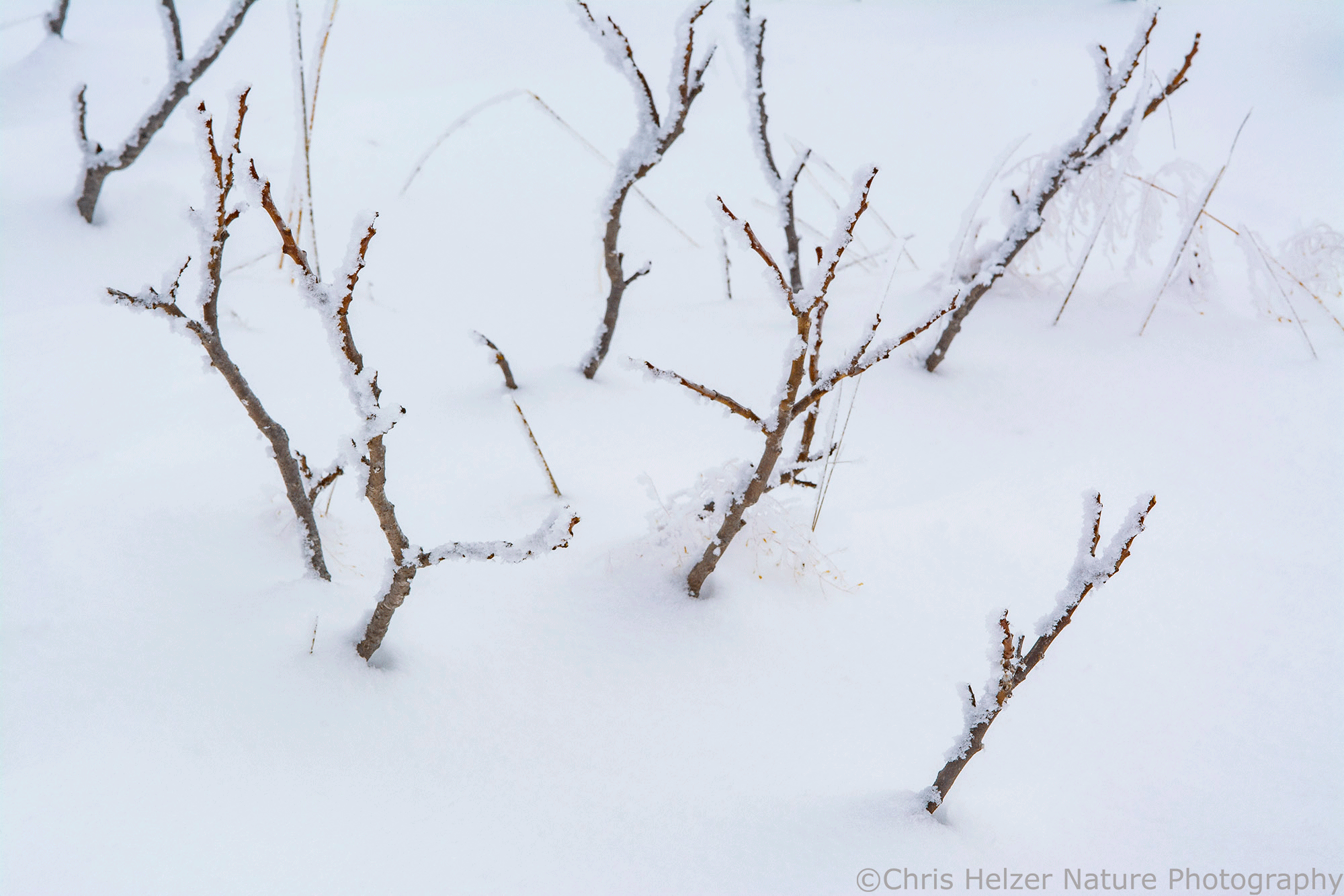 I also played with the simple, nearly monochromatic patterns of grasses and shrubs against a muted white background. Snow loses a lot of its texture in the absence of direct sunlight. When darker clouds moved in front of the sun, I concentrated on those simple patterns. During brief periods of brighter light when the snow texture was more evident, I used my macro lens to photograph rose hips and sumac leaves. Before I knew it, I’d spent a very pleasant hour getting covered in snow.