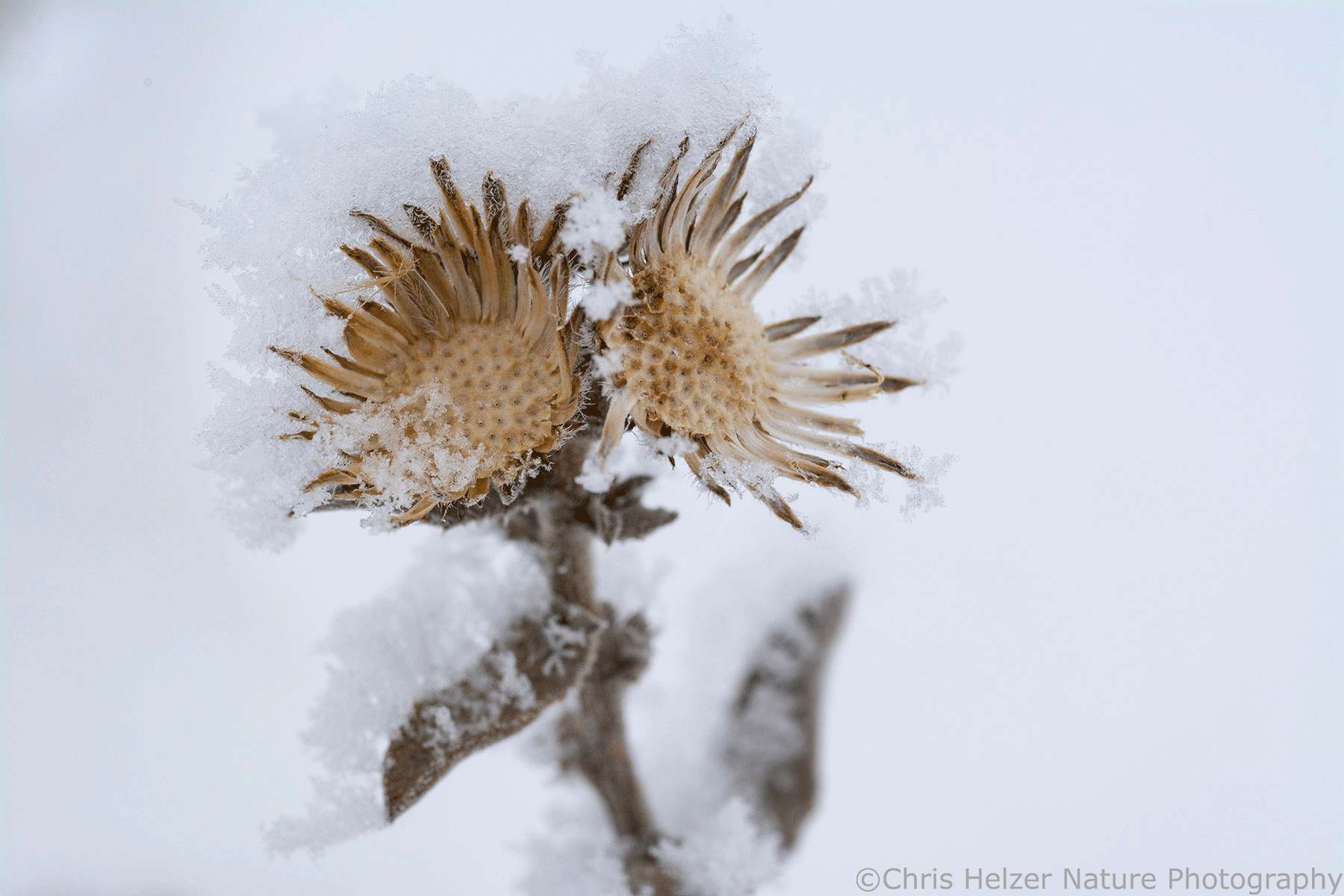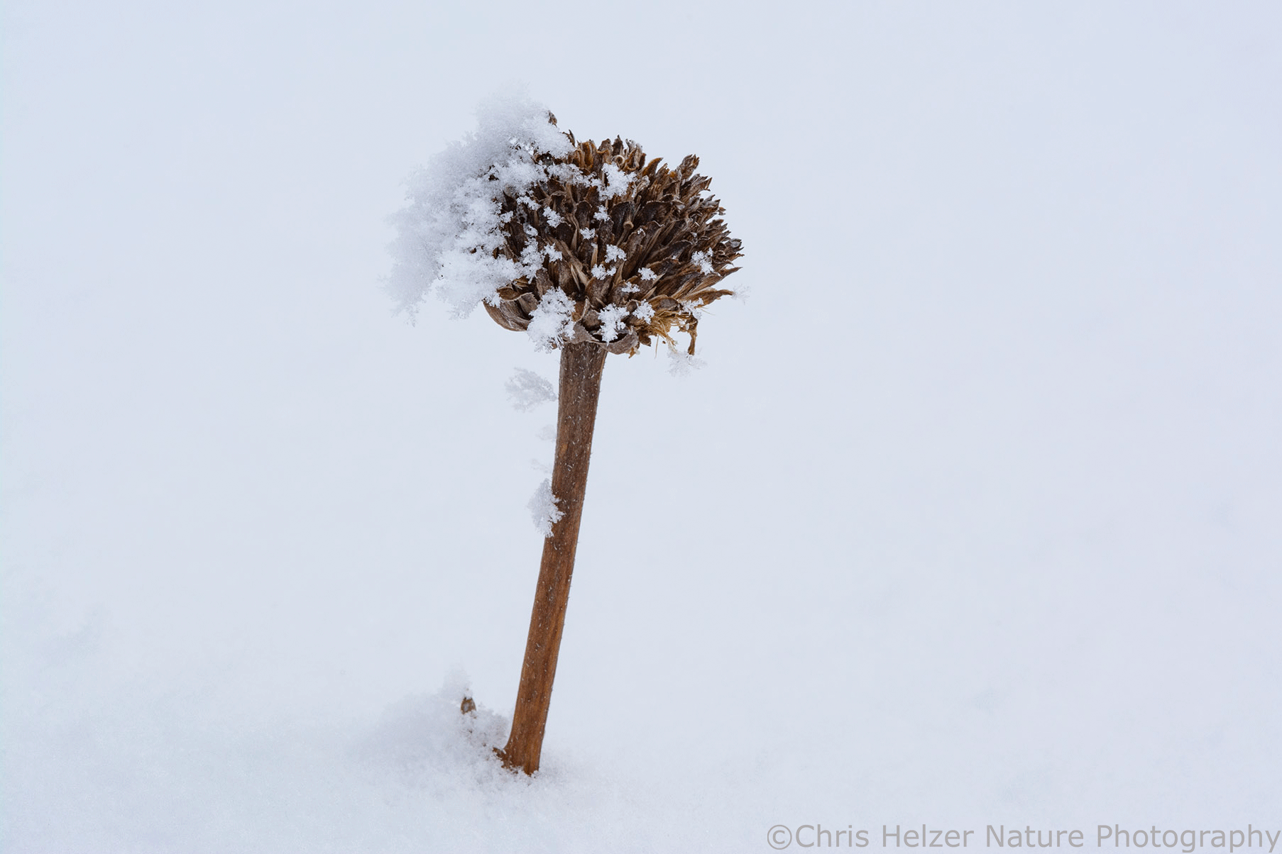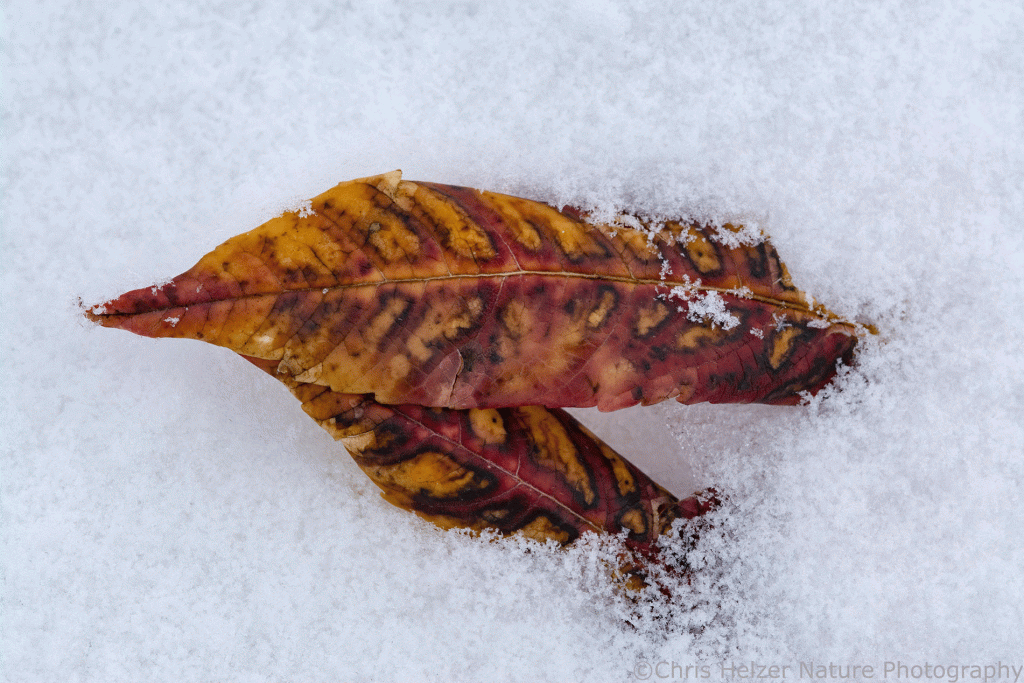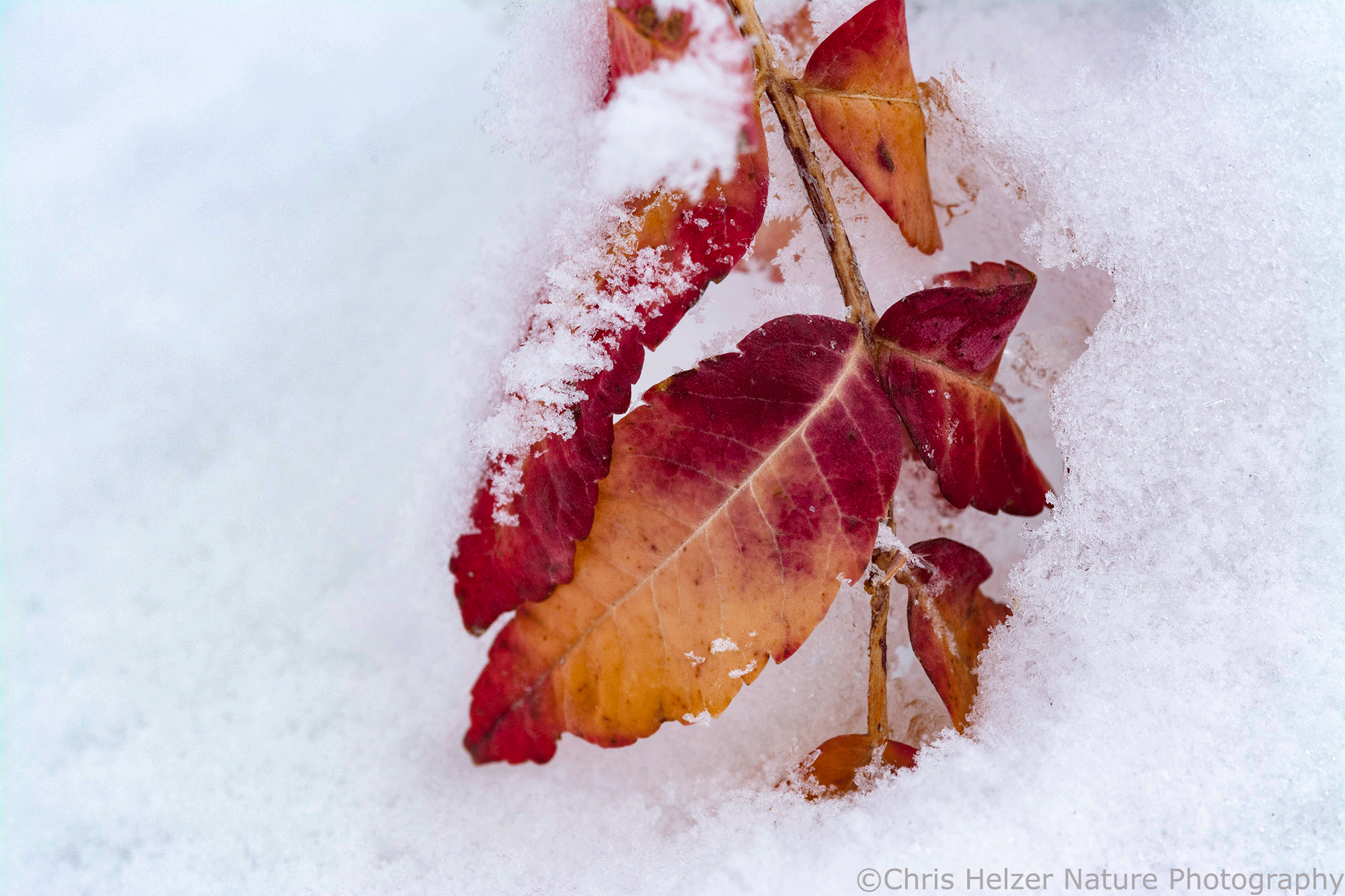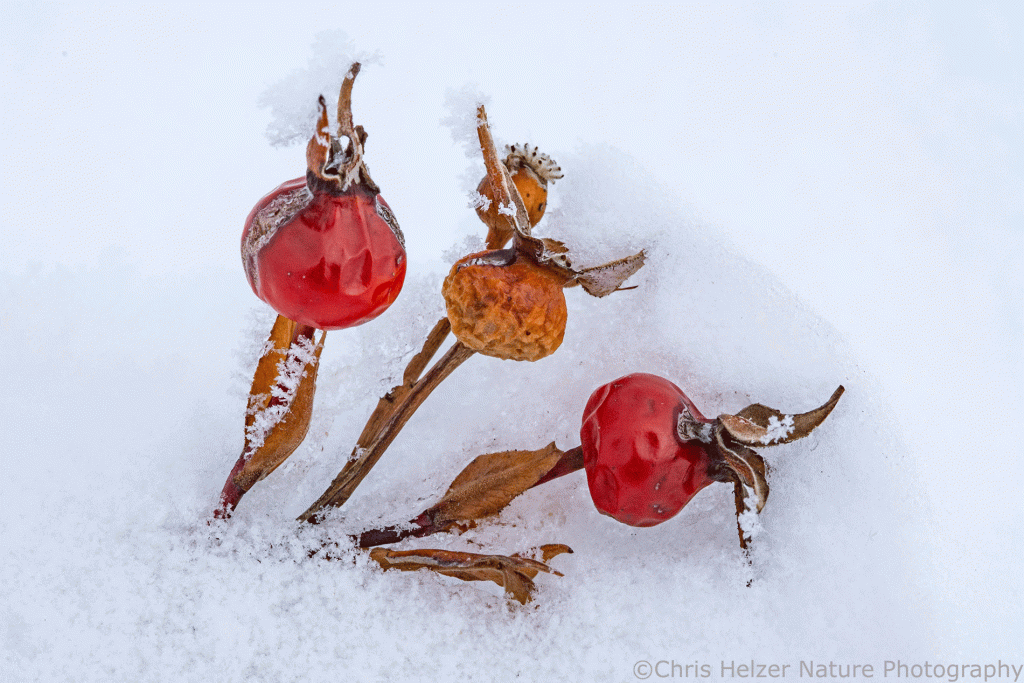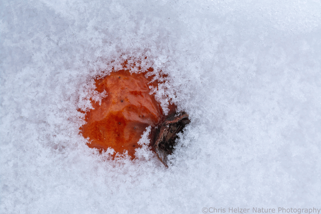 I also played with the simple, nearly monochromatic patterns of grasses and shrubs against a muted white background. Snow loses a lot of its texture in the absence of direct sunlight. When darker clouds moved in front of the sun, I concentrated on those simple patterns. During brief periods of brighter light when the snow texture was more evident, I used my macro lens to photograph rose hips and sumac leaves. Before I knew it, I’d spent a very pleasant hour getting covered in snow.