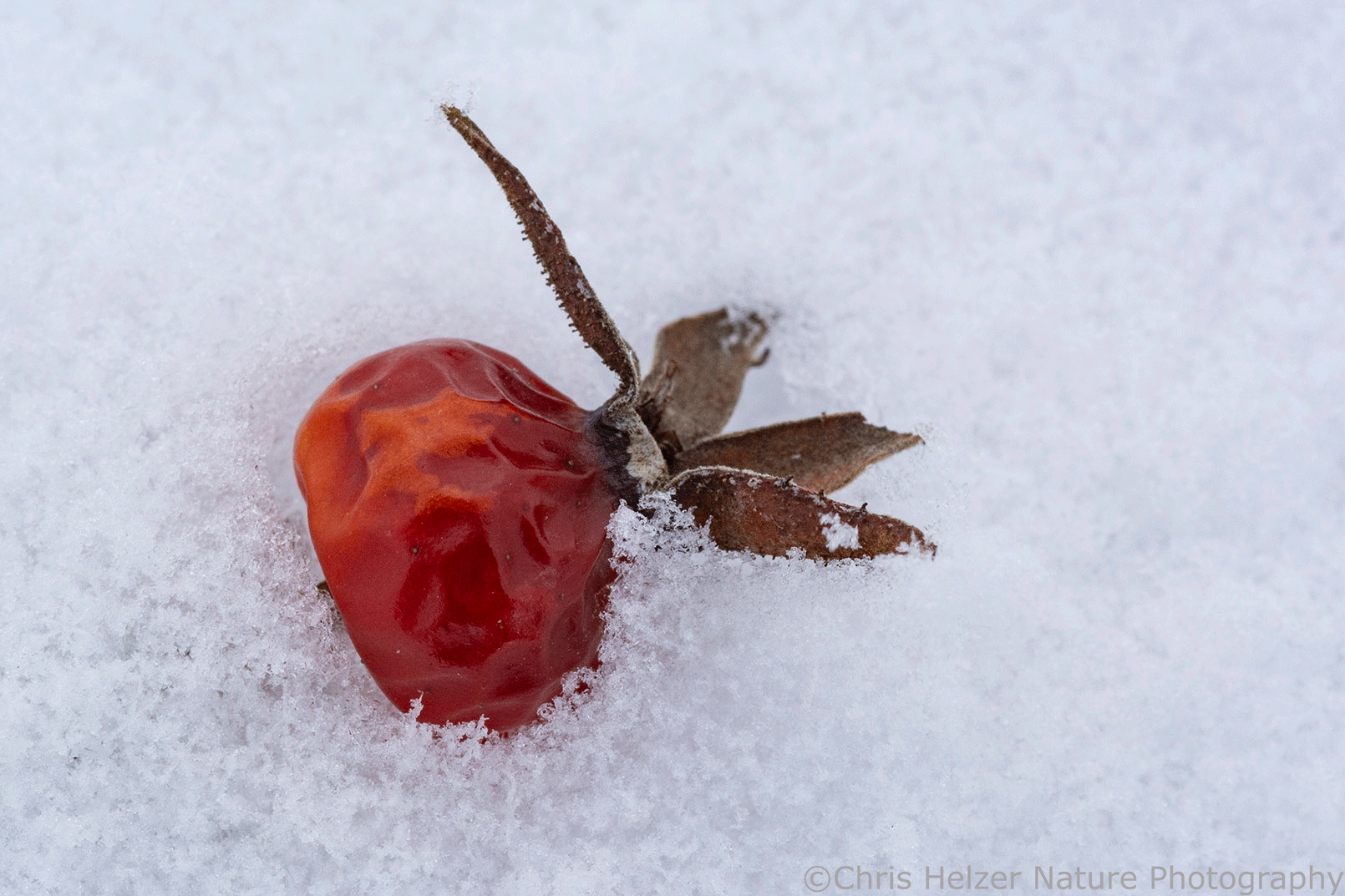 I tried a few landscape photos but, as usually happens, I was more drawn to little subjects. In particular, there were little bits of color emerging from the snow here and there. A few smooth sumac leaves were still holding their autumn red color. Even better, I wandered into a big patch of prairie wild rose with bright scarlet hips (fruits) that hadn’t yet dried out and lost their vibrance.