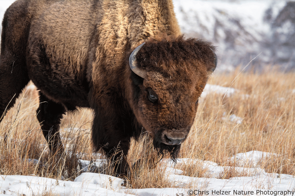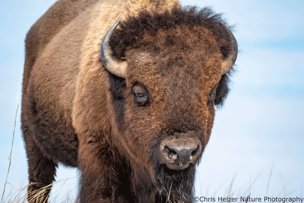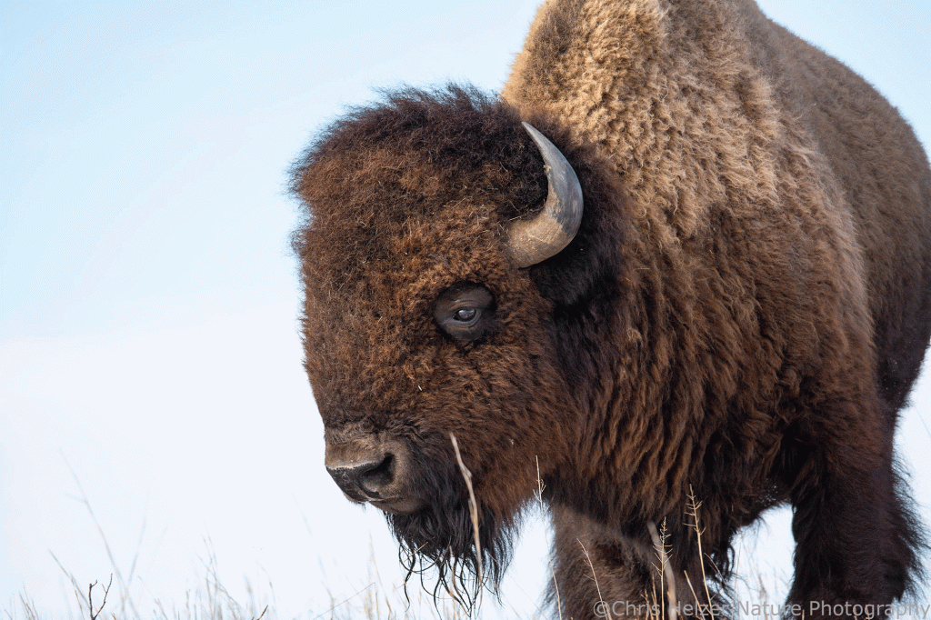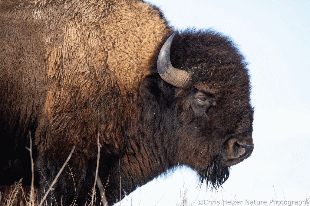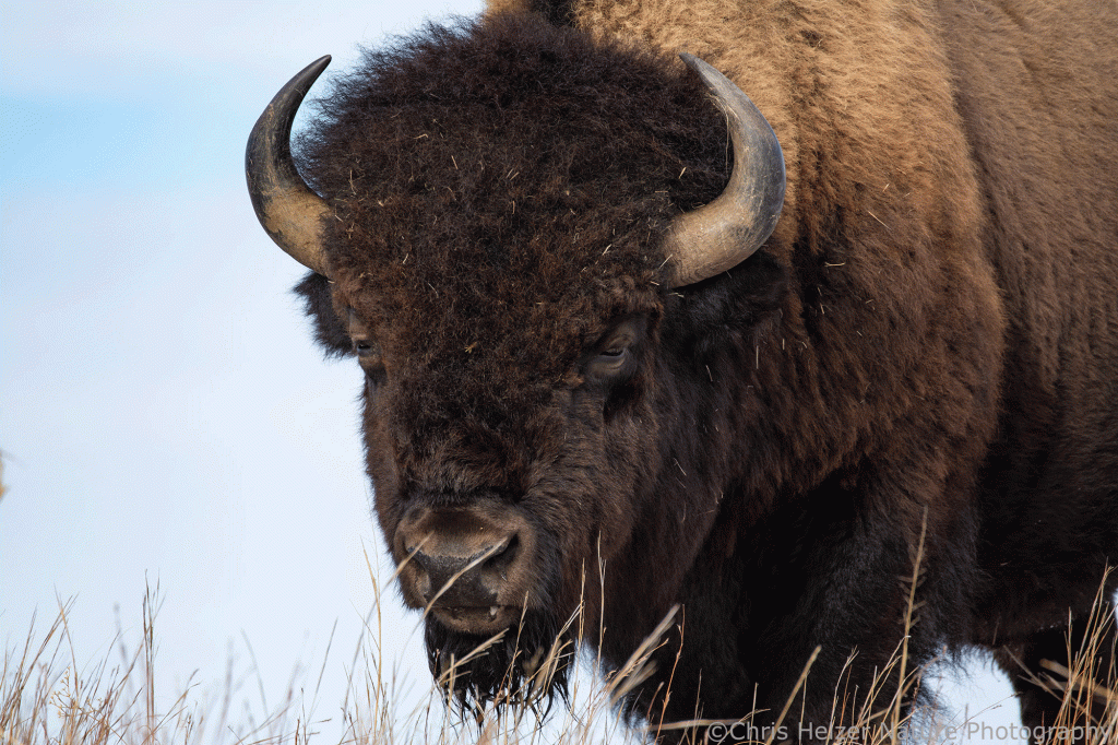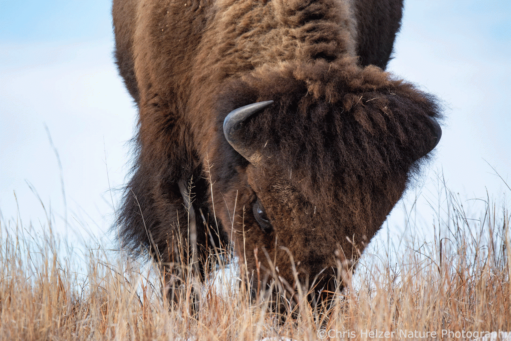 Because bison have such dark hair, especially on their faces, exposure settings can be challenging. Especially in more intense light, the contrast between that dark hair and a bright sky is more than a camera likes to deal with. As a result, I had to really watch the histogram (showing the range of light intensity being captured) to make sure both the dark and light ends of the range were within the boundaries. It wasn’t always possible, especially when the afternoon sun was fully out and not being diffused by thin clouds.