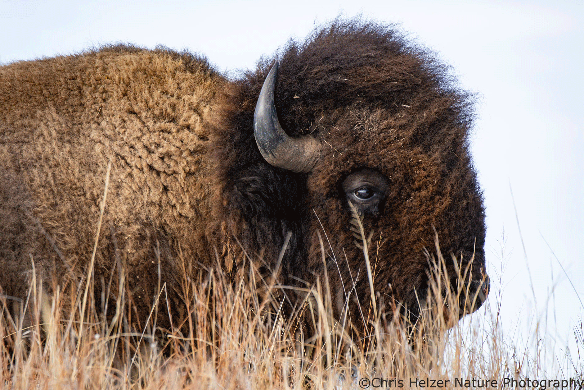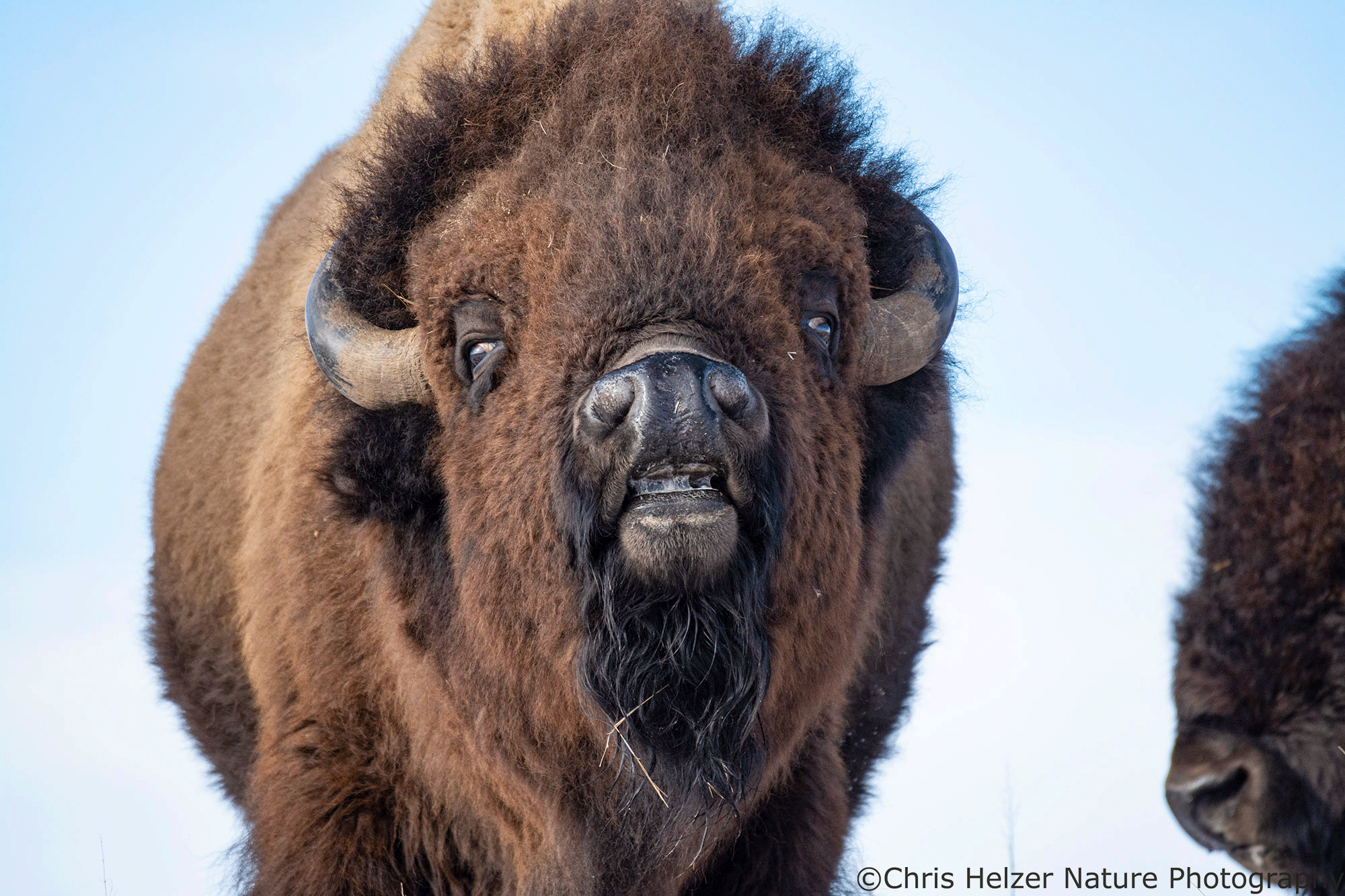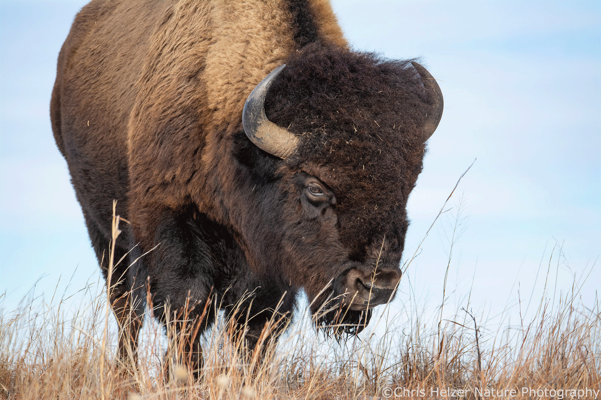 Because bison have such dark hair, especially on their faces, exposure settings can be challenging. Especially in more intense light, the contrast between that dark hair and a bright sky is more than a camera likes to deal with. As a result, I had to really watch the histogram (showing the range of light intensity being captured) to make sure both the dark and light ends of the range were within the boundaries. It wasn’t always possible, especially when the afternoon sun was fully out and not being diffused by thin clouds.