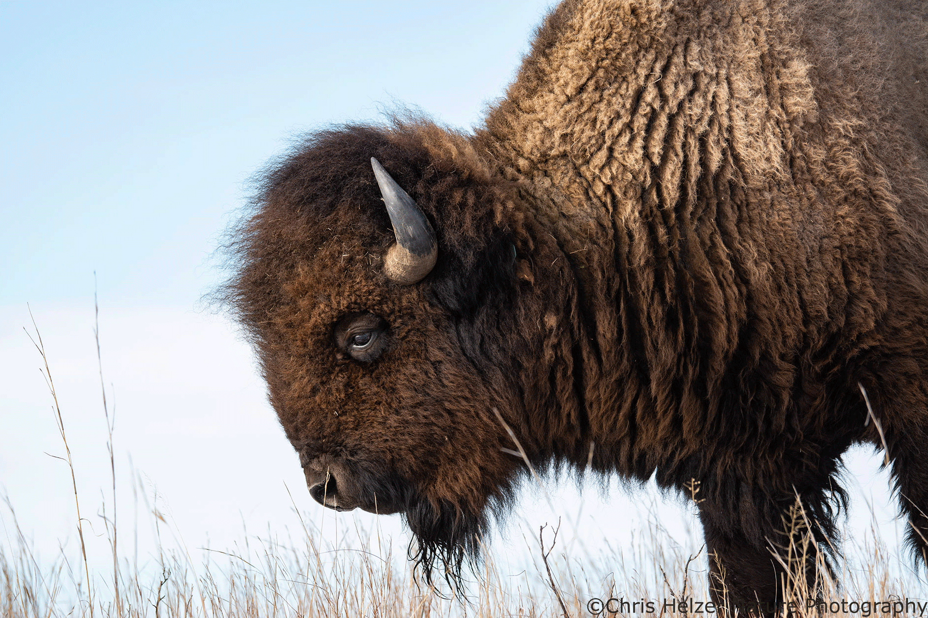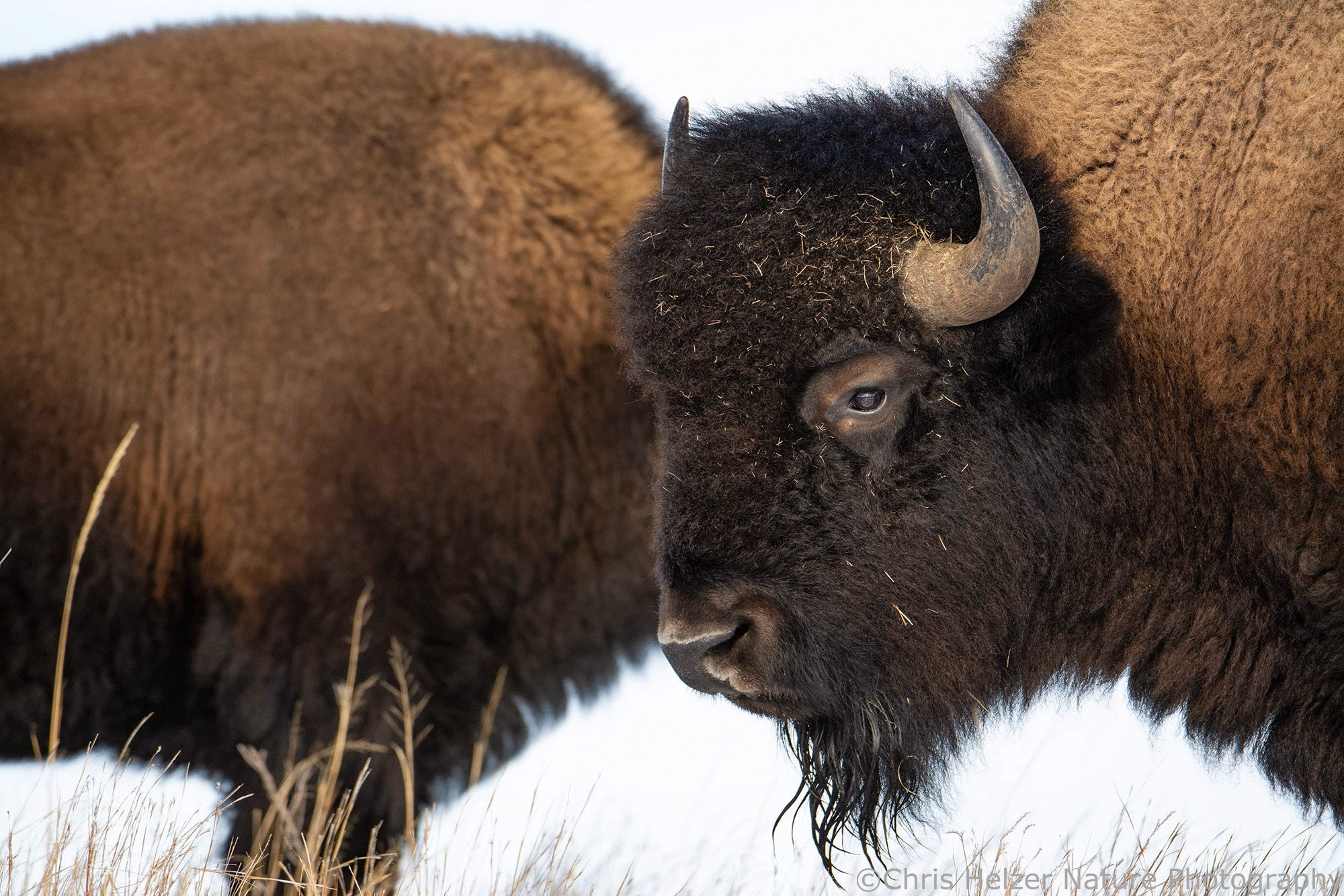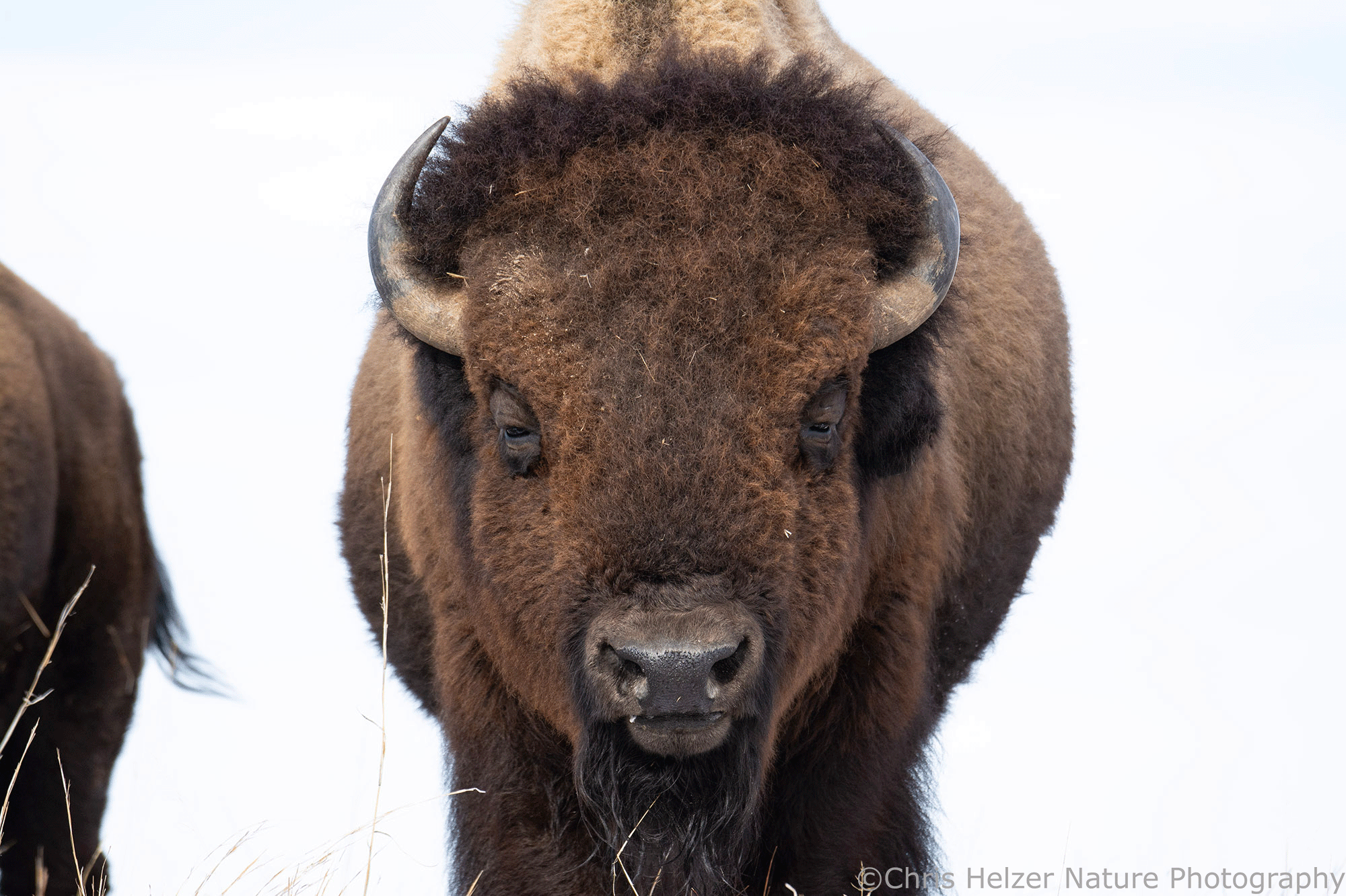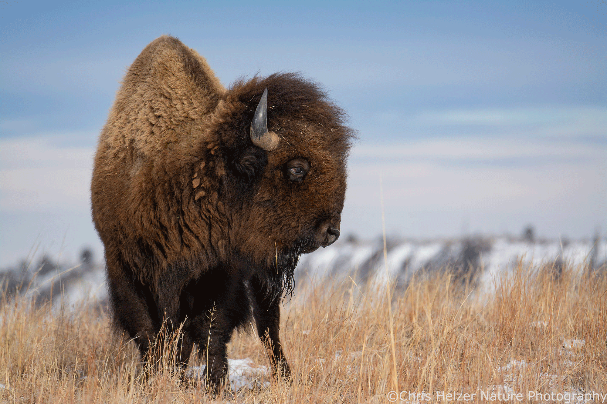 Because bison have such dark hair, especially on their faces, exposure settings can be challenging. Especially in more intense light, the contrast between that dark hair and a bright sky is more than a camera likes to deal with. As a result, I had to really watch the histogram (showing the range of light intensity being captured) to make sure both the dark and light ends of the range were within the boundaries. It wasn’t always possible, especially when the afternoon sun was fully out and not being diffused by thin clouds.