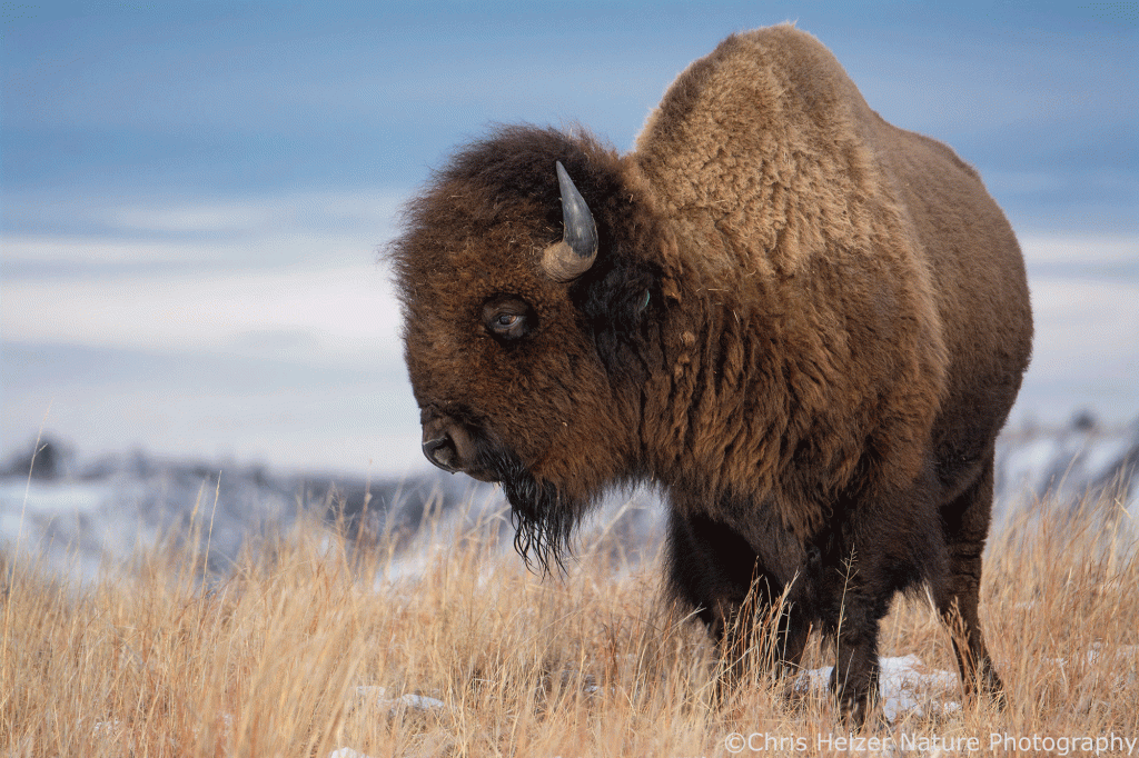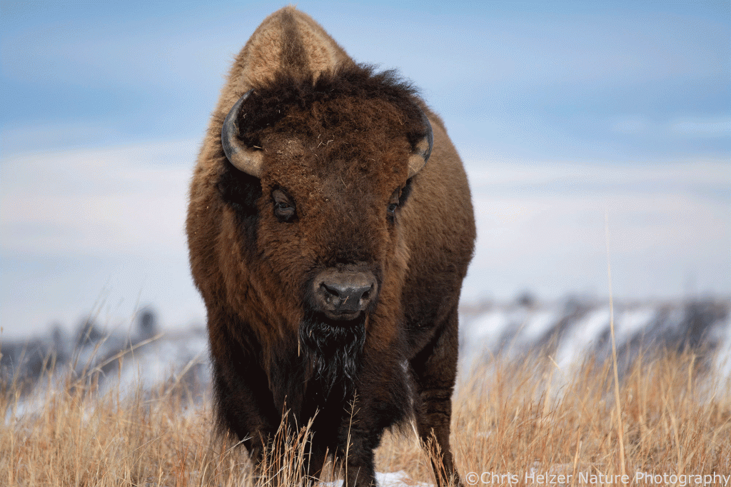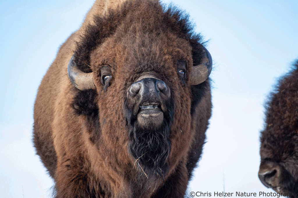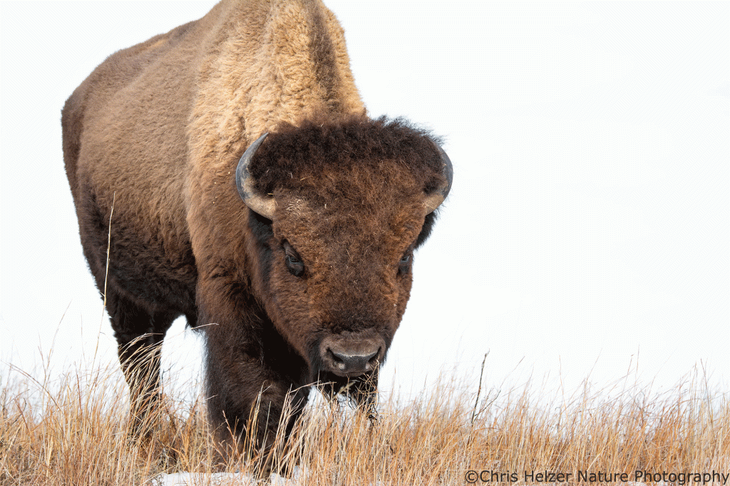 Here are two photos that I liked with nearly or completely white backgrounds, followed by an example of an image with both backgrounds. I can’t decide which I like better. It’s also an interesting philosophical conundrum: which is the ‘right’ way to depict the bison and its surroundings? Neither is the way the camera produced the scene, so both are artistic renditions. The blue sky is more like what my eyes and brain registered at the time, which is usually my guiding star when editing. On the other hand, the bison with a white background is pretty eye-catching, and since one of my aims is to get people to care about conservation, powerful images are important and helpful.