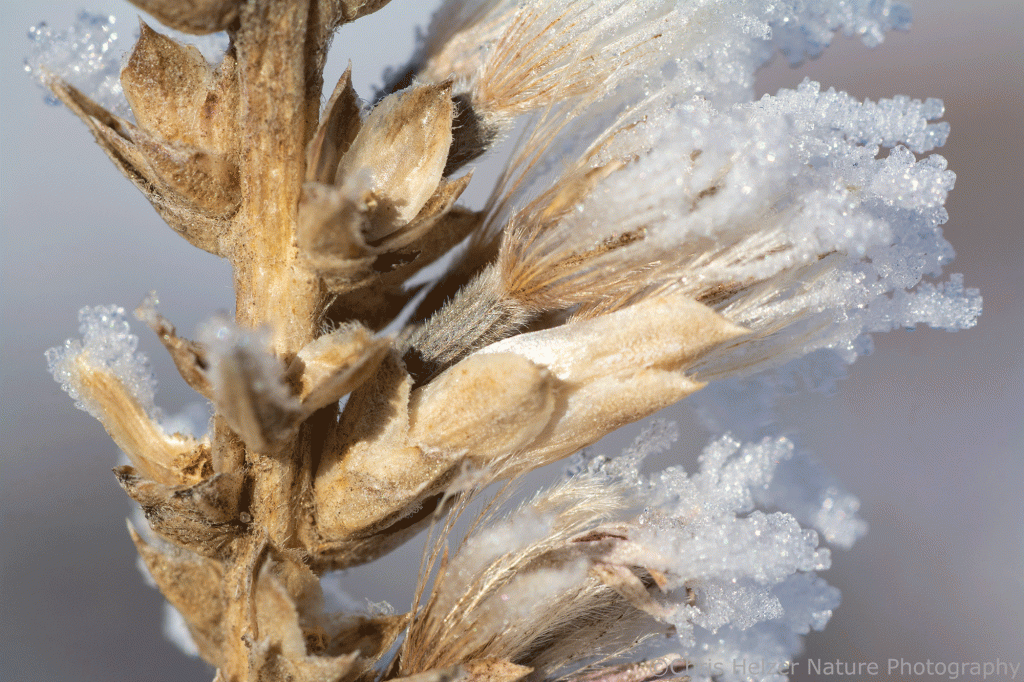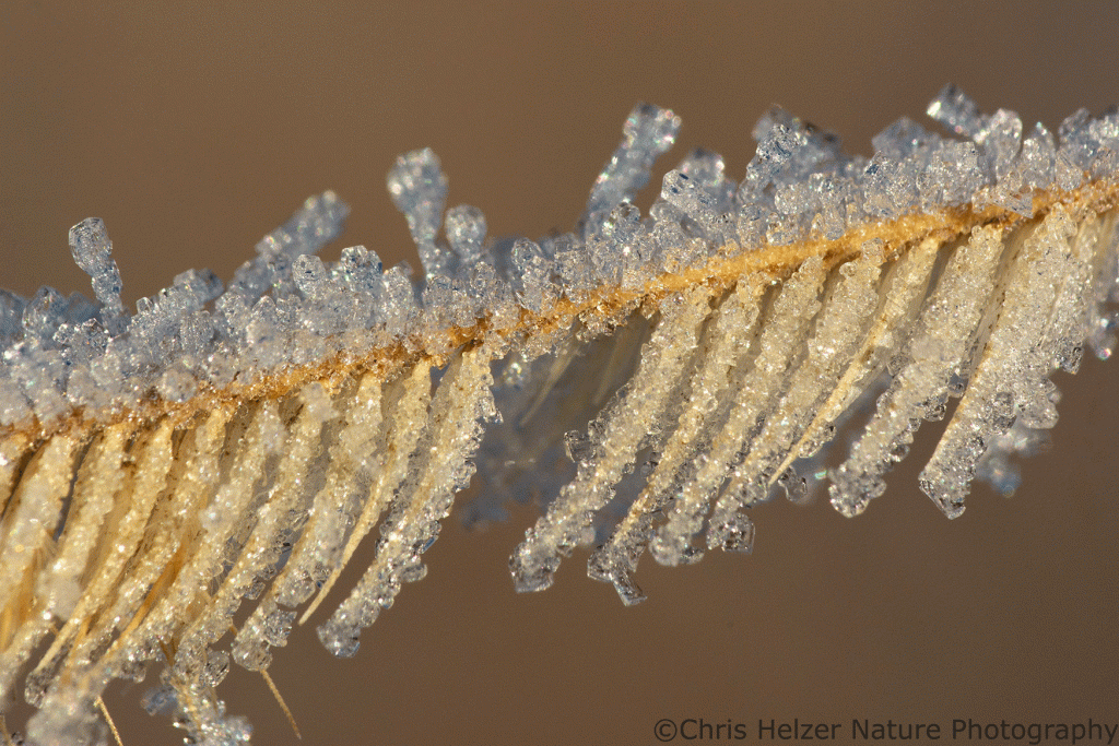 Once the sun was up, I switched to my macro lens and started exploring the frosty landscape for little jewels. Blue grama seed heads were sticking up through the snow all around me, so they were easy targets. However, EVERYTHING was covered in frost, so narrowing my choices was one my biggest challenge.