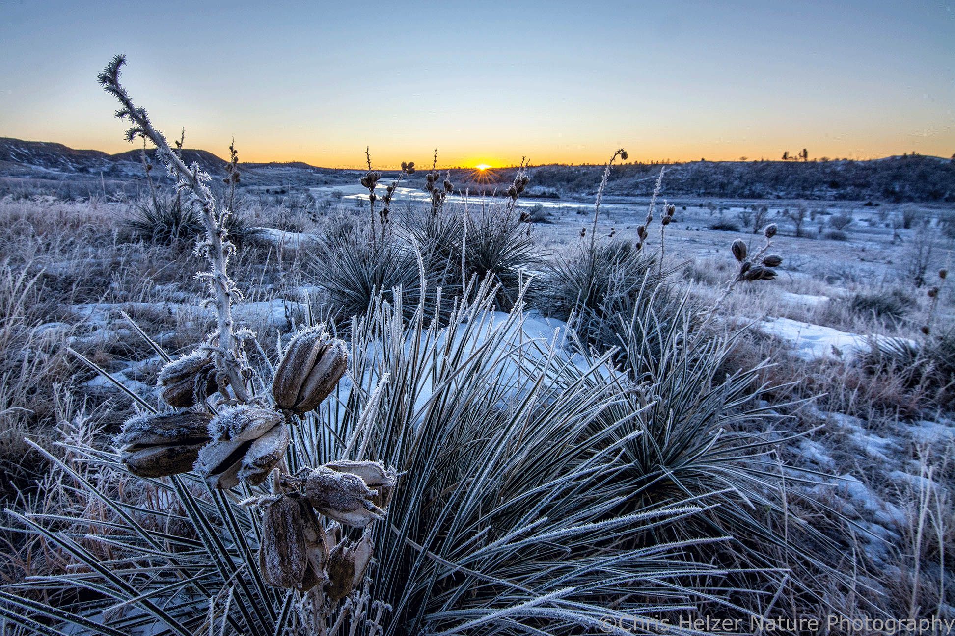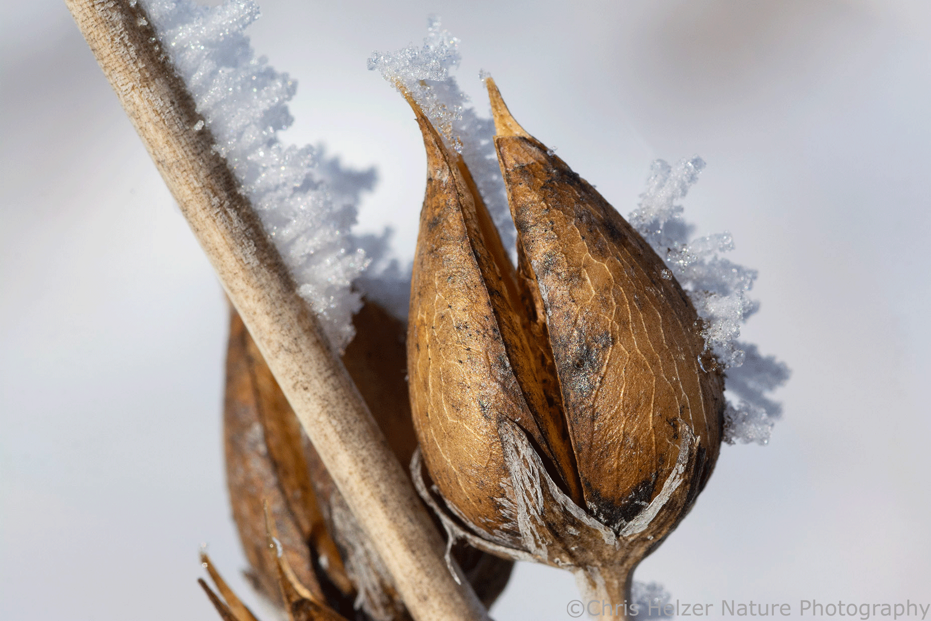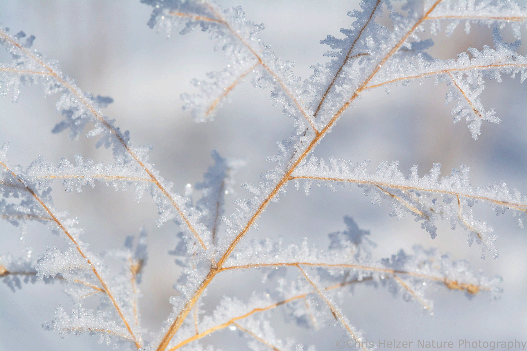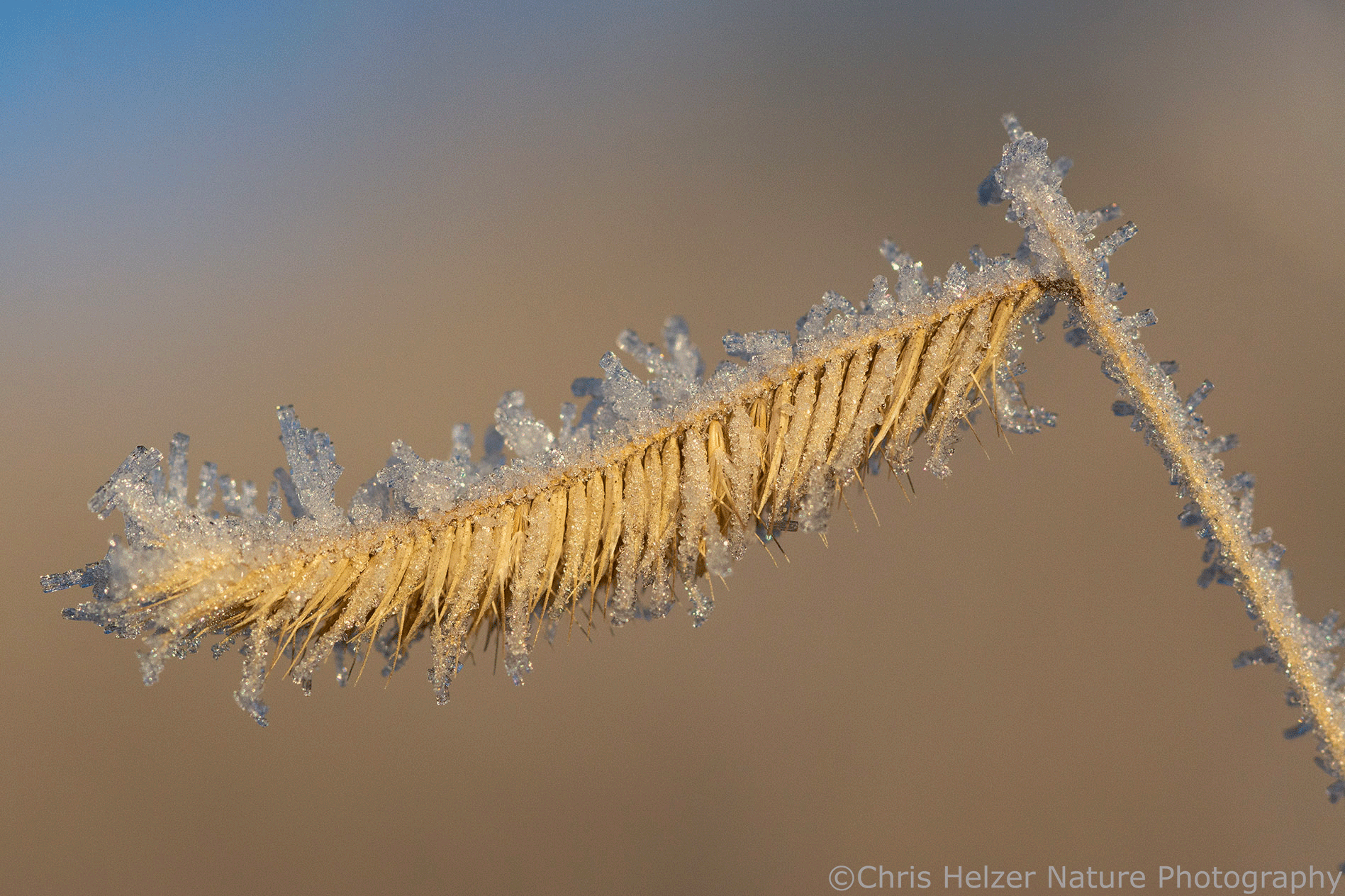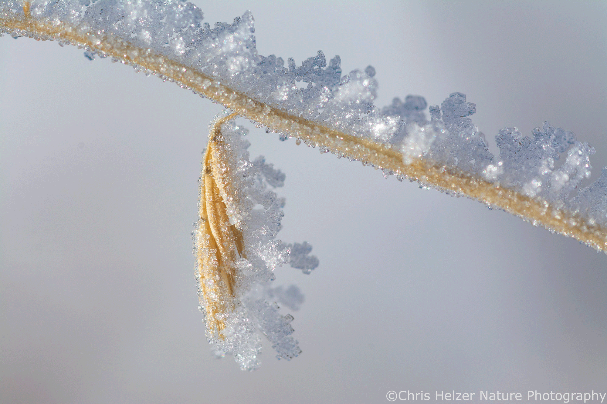 Once the sun was up, I switched to my macro lens and started exploring the frosty landscape for little jewels. Blue grama seed heads were sticking up through the snow all around me, so they were easy targets. However, EVERYTHING was covered in frost, so narrowing my choices was one my biggest challenge.