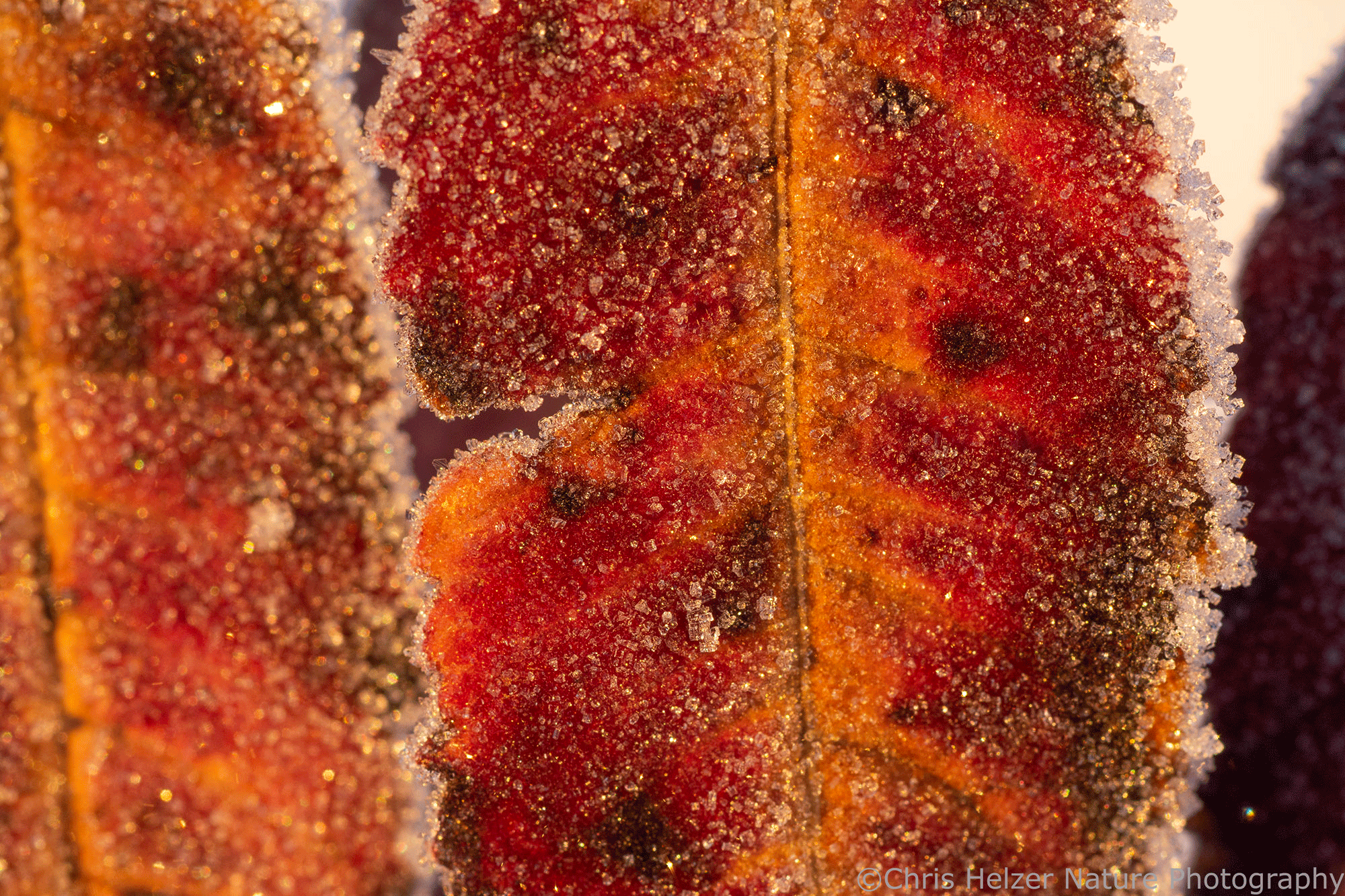 Smooth sumac leaves and frost. Nikon 105mm macro lens. ISO 500, f/16, 1/60 sec.